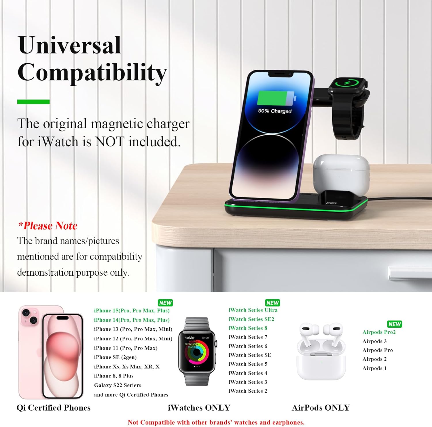 - đăUniverselle KompatibilitĂ€tăDiese 3-in-1 kabellose Ladestation ist perfekt kompatibel mit iPhone 14/14 Pro/14 Pro Max/14 Plus, iPhone 13 mini/13/13 Pro/13 Pro Max/12 mini/12 Pro/12 Pro Max/SE/11/11 Pro/11 Pro Max/Xs/Xs Max/XR/x/8/8 Plus und
