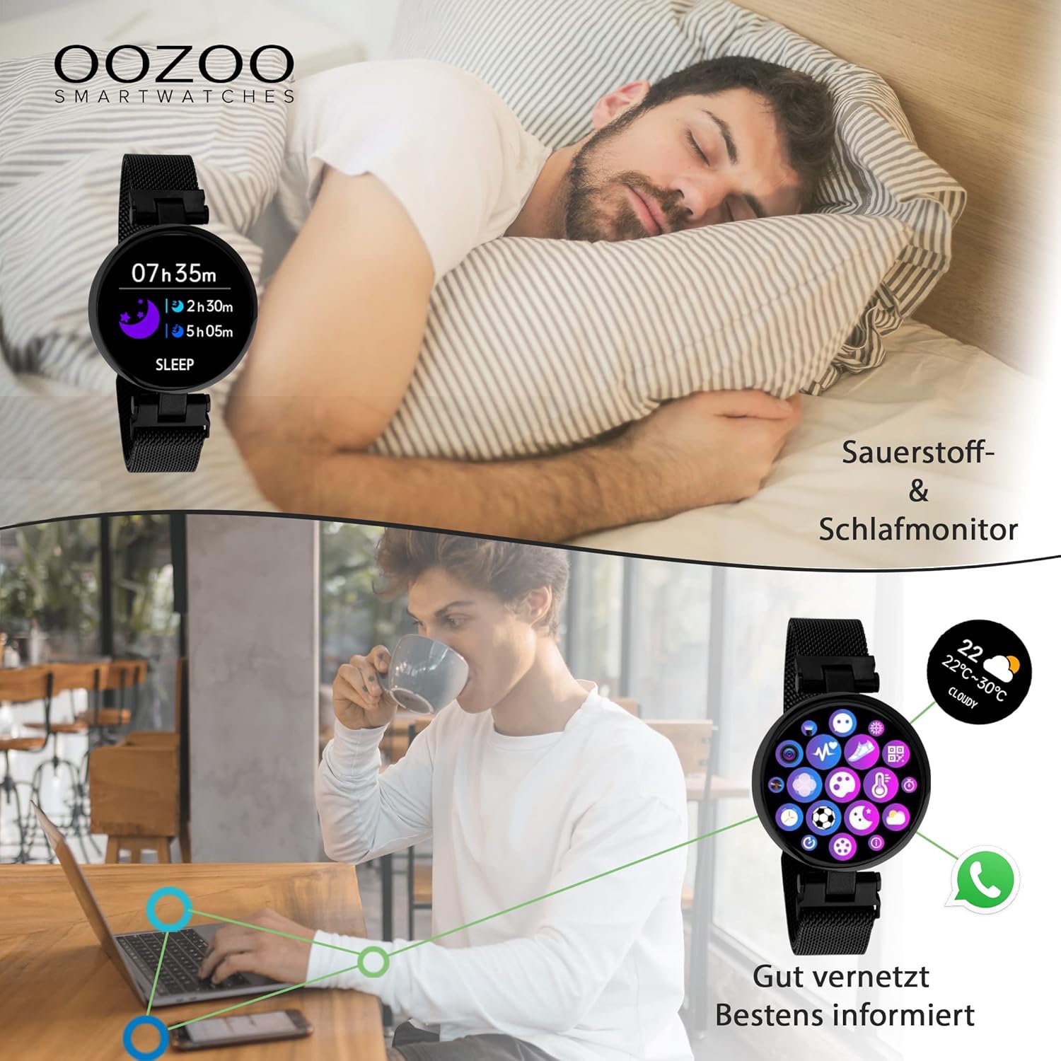 - 🔀 MULTIFUNKTIONAL - Pulsuhr rund mit Musiksteuerung, Kamerasteuerung, Stoppuhr, 3 ver. Oozoo Ziffernblättern sowie weitere Ziffernblätter, auch individualisierbar, über die App.
