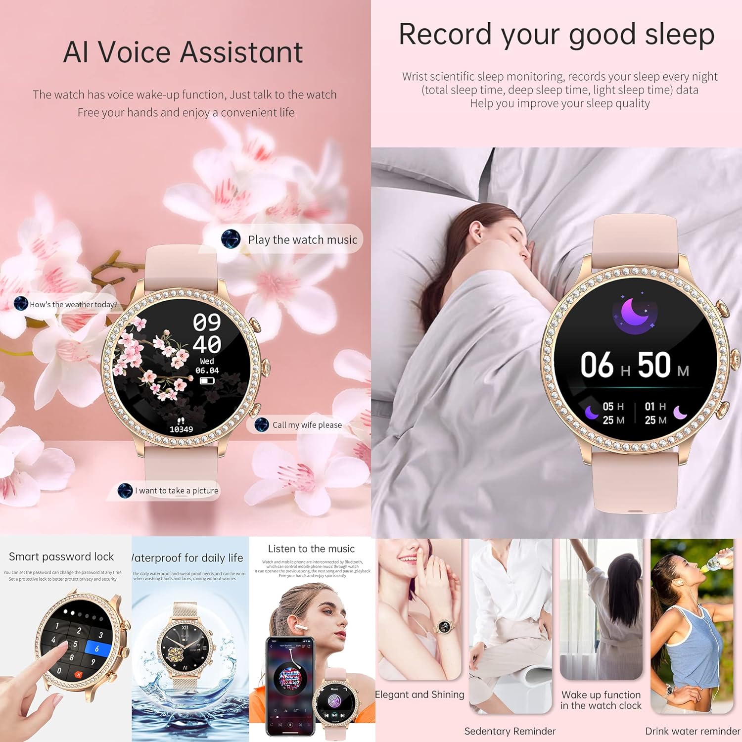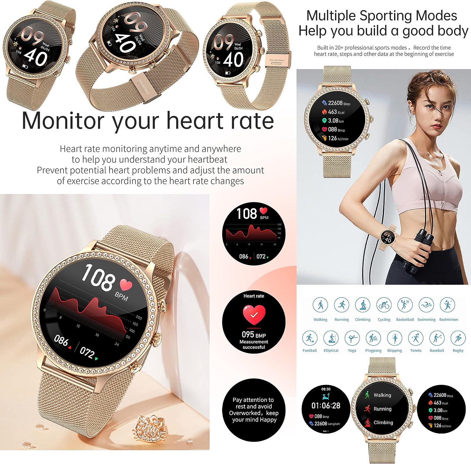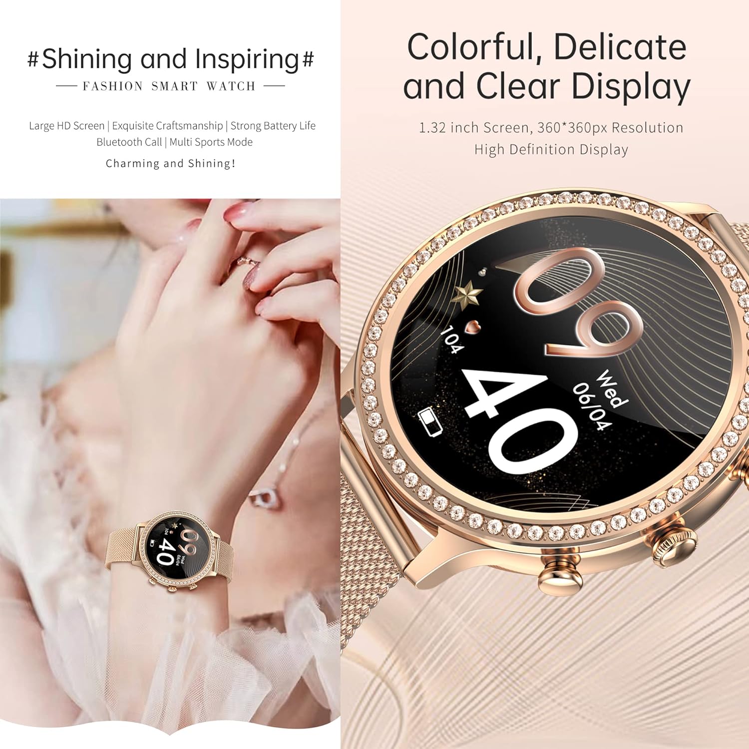 - ⌚【1,32 "HD-Bildschirm und Personalisierter Bildschirm】 Smartwatch Damen verwendet einen 1,32-Zoll-Glasbildschirm mit hoher Härte und einer hohen Auflösung von 360 * 360, um Ihnen den klarsten visuellen Genuss zu bieten. Die Lünette ist mit 60