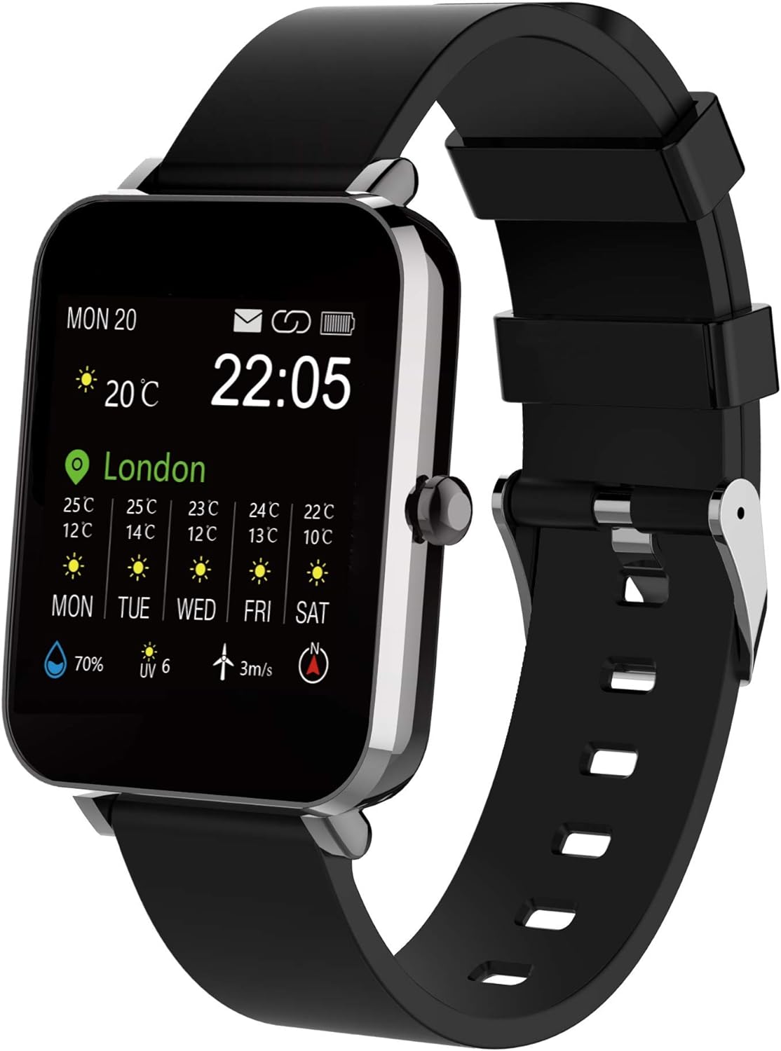 - 8 verschiedene Sport-Modi, Musik-Steuerung, 15 Tage Wettervorhersage, Stoppuhr, Timer, Entspannungsübung, Handy-Finder, Musik-Steuerung, Nicht Stören - Modus, etc.
