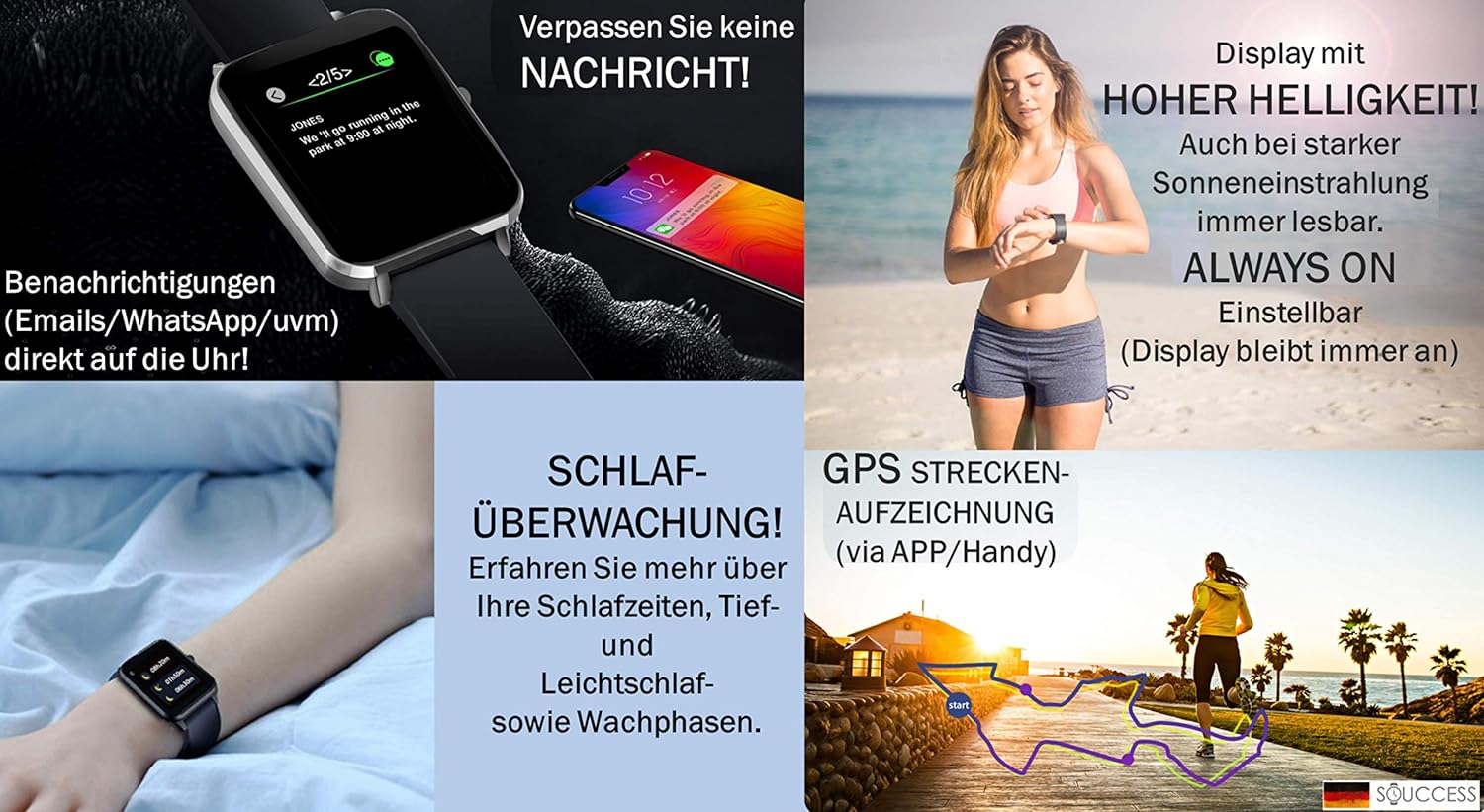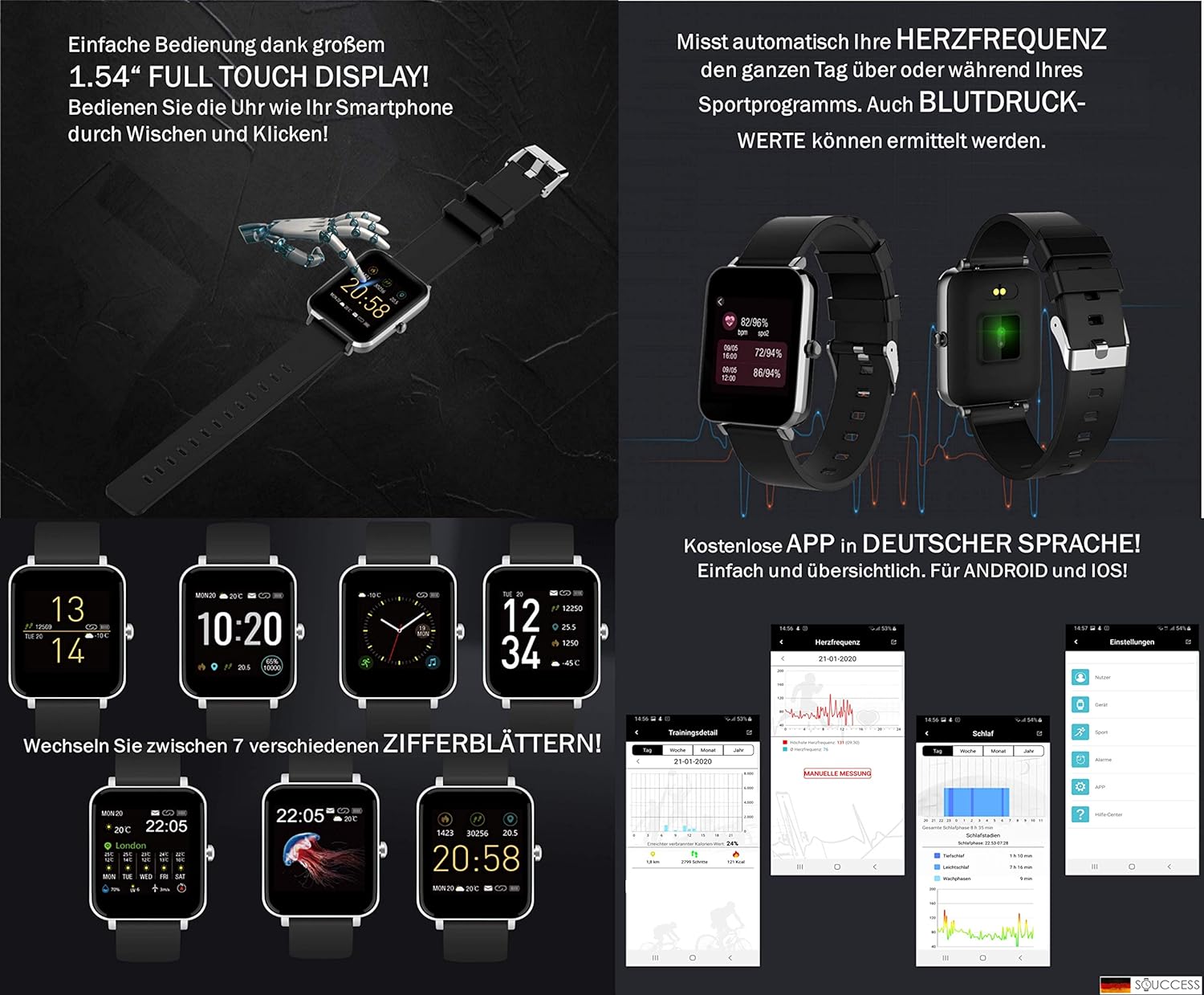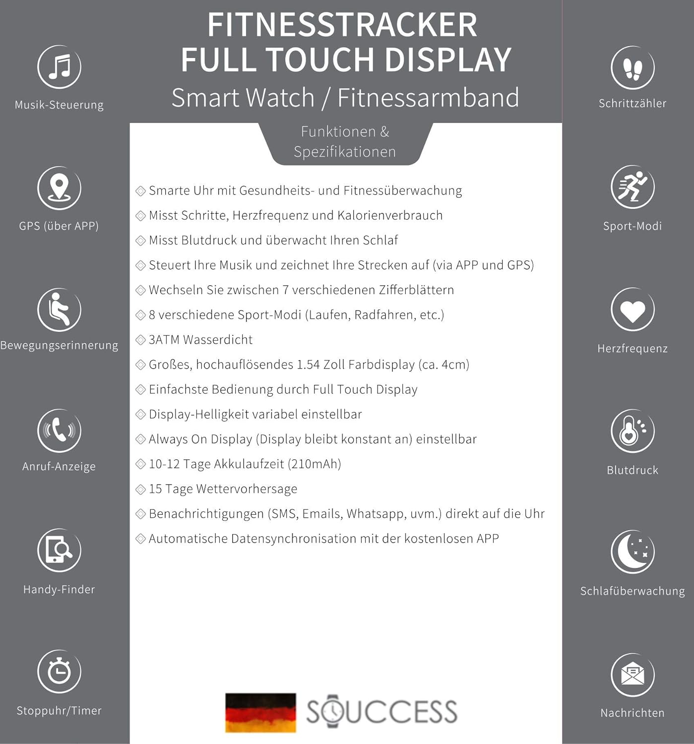 - Smartwatch mit Gesundheits-(Herzfrequenz/Blutdruck), Fitness-(Schrittzähler/Kalorien) und Schlafüberwachung