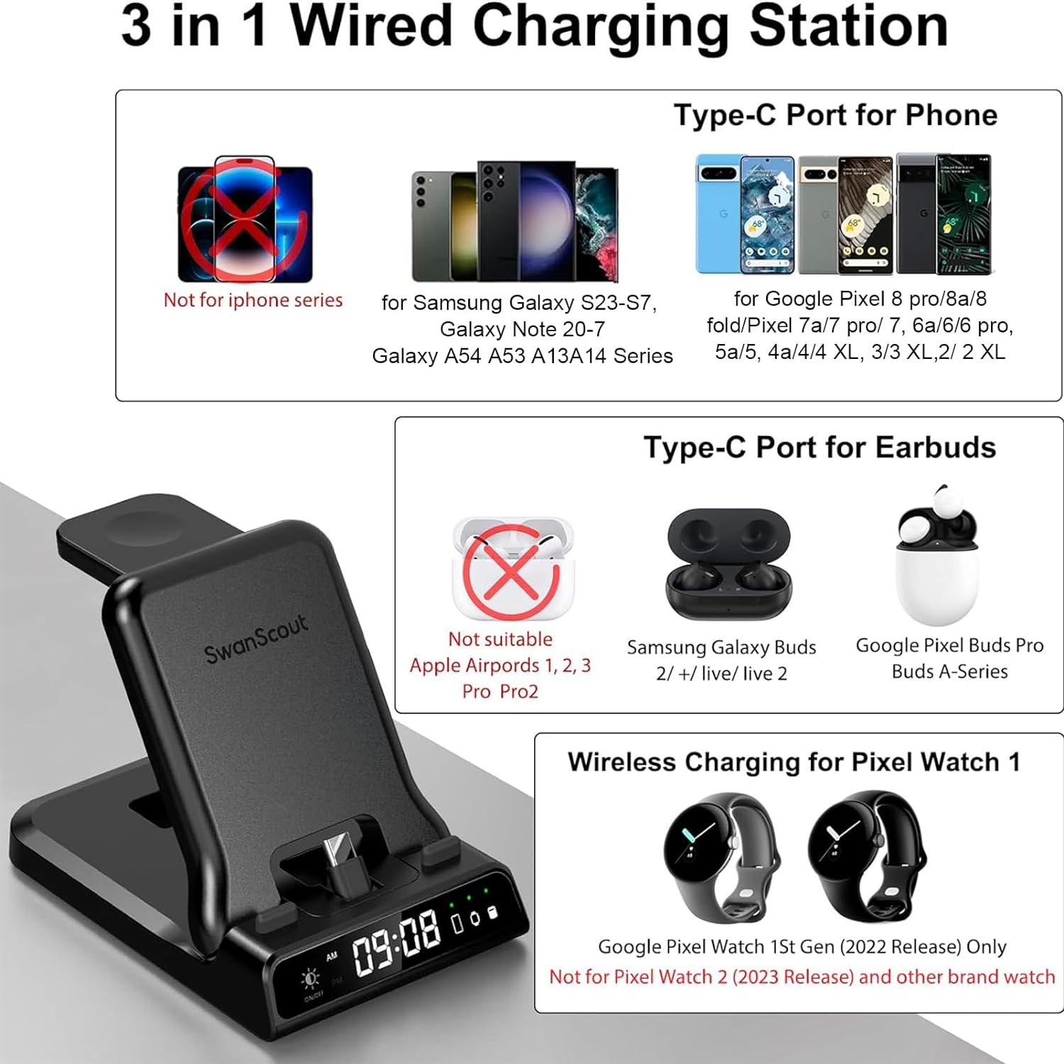 - Ladestation für Google Pixel Watch - SwanScout 3-in-1-Schnellladestation, entwickelt für das gleichzeitige Aufladen von Google Geräten. Die USB-C Ladeanschlüsse sind für das Aufladen von Google Pixel Handys und Google Pixel Buds vorgesehen und