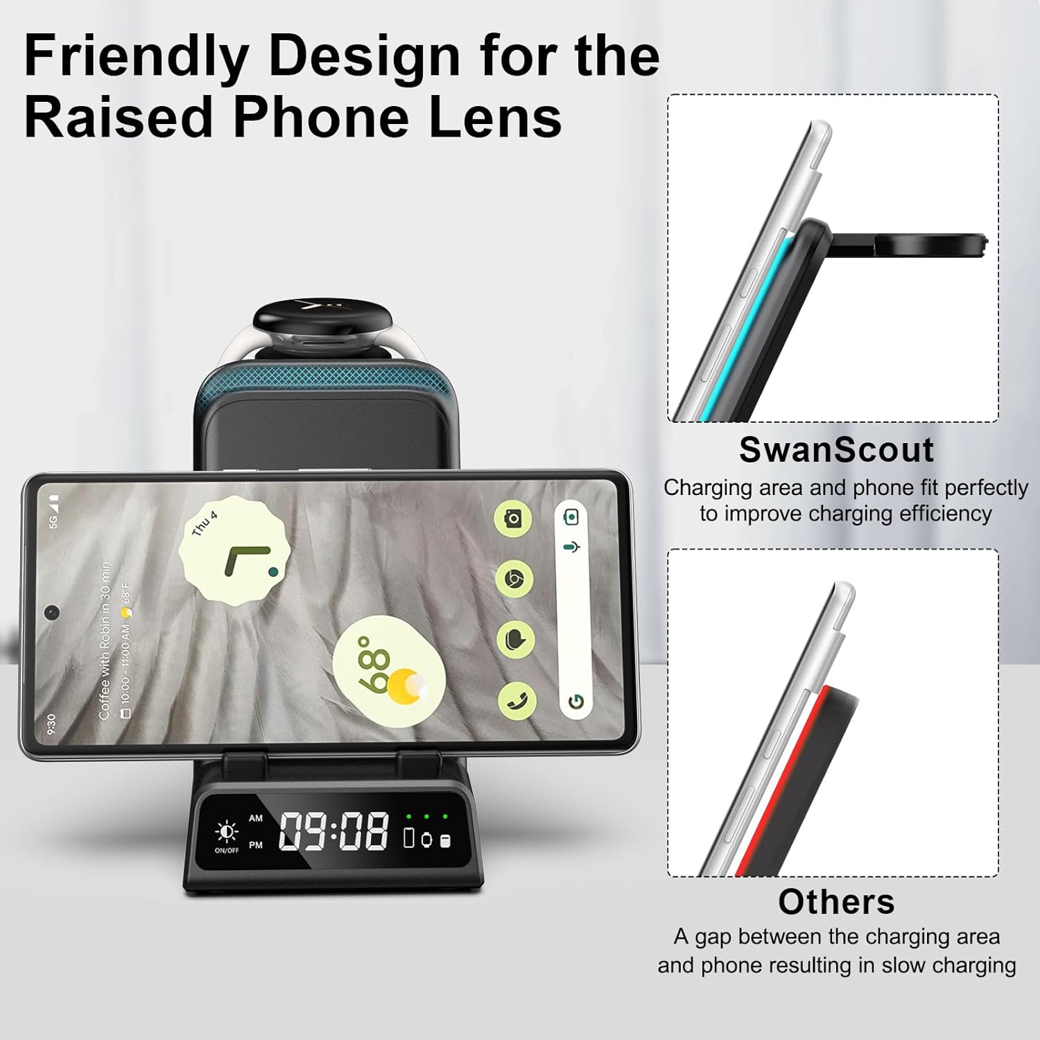 - 4 in 1 Google Induktive Ladestation: Erleben Sie den Komfort, Ihre Google Geräte gleichzeitig aufzuladen. SwanScout Wireless Charger unterstützt die Google Pixel Watch, Google Pixel 8 Pro/8/7a/7/7 Pro, Pixel 6/6 Pro, Pixel 5, Pixel 4/4 XL und die