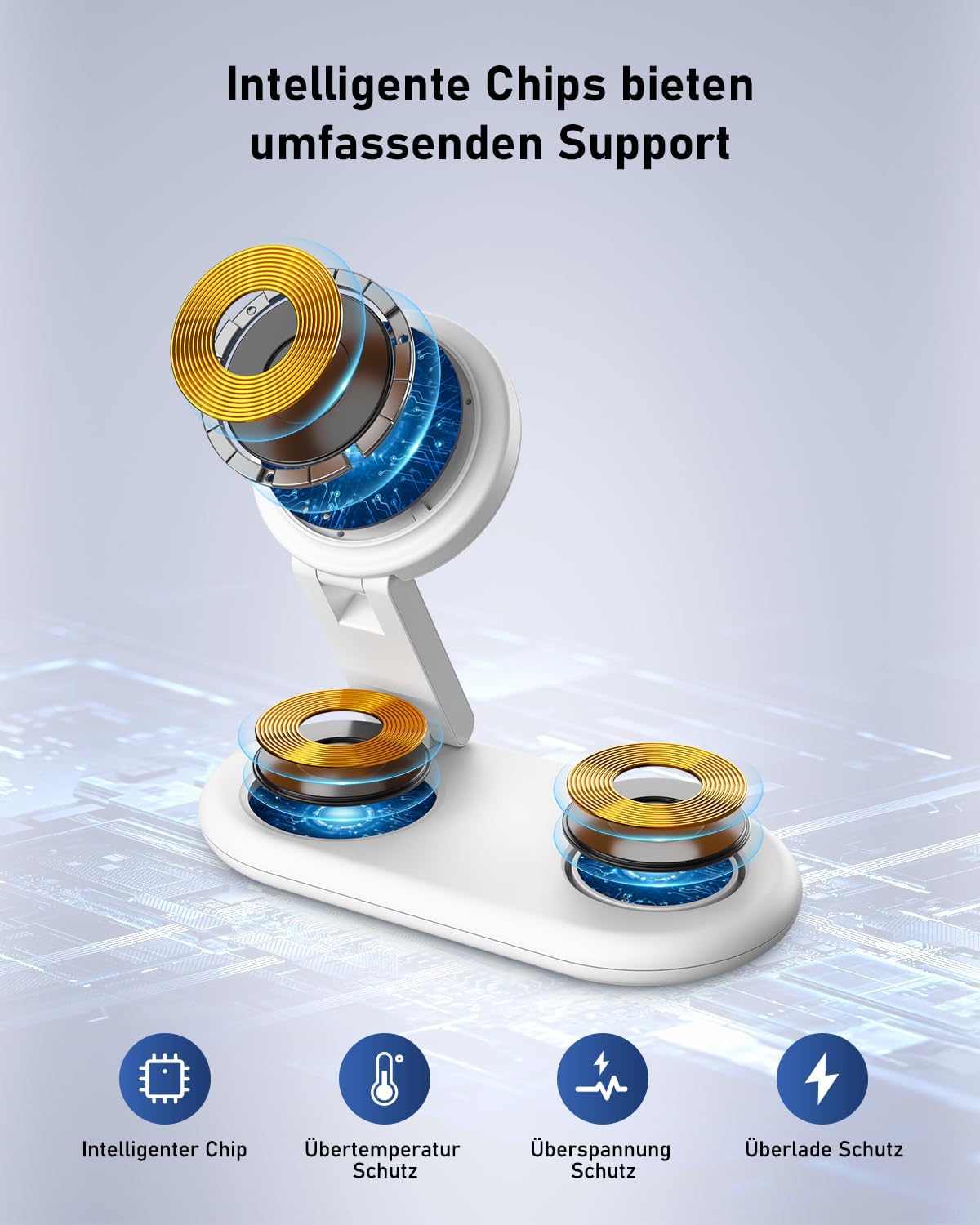 - Verbesserte thermische Leistungsfähigkeit: Diese Ladestation verfügt über einen eingebauten Superchip, der die Wärme beim Laden Ihrer Geräte hervorragend ableitet. Ein intelligenter Chip von diesem Wireless Charger schützt vor Bedrohungen wie: