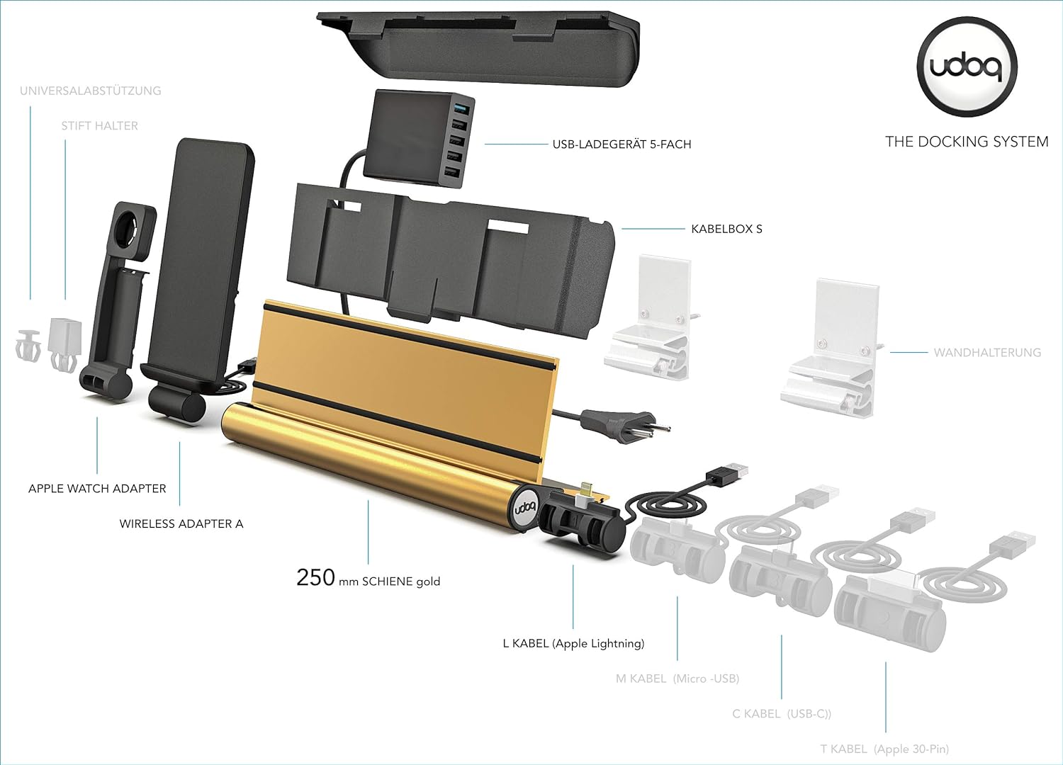 - LIEFERUMFANG | Aluminiumschiene 25x10x9 cm | 1 Wireless Adapter | 1 Apple Lightning Kabel | 1 Apple Watch Adapter (ohne Kabel) | 5-fach USB Ladegerät | 1 Kabelbox | 100 TAGE RÜCKGABERECHT