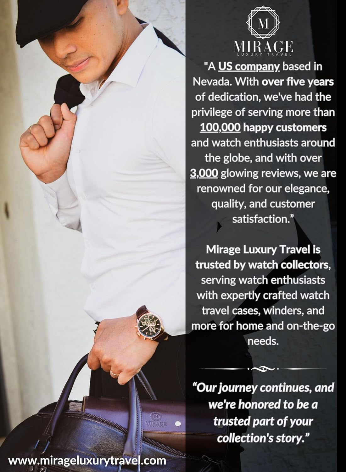 - Ursprünglich entworfen von Mirage Luxury Travel – Wir sind die stolzen Entwickler dieses einzigartigen Reise-Uhrenetuis aus Leder im schweizerischen Designstil. Elegant handgefertigte Uhrengehäuse für Herren aus hochwertigem, veganem Leder. Mit