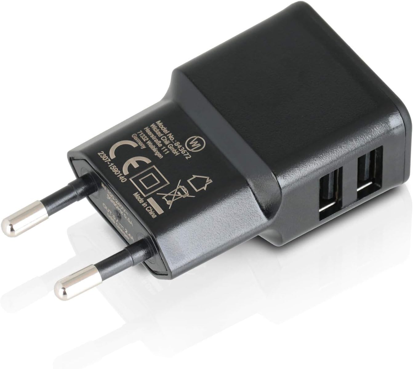 - Lieferumfang: 4 Stück Wicked Chili Dual-USB-Netzstecker / Ladegerät für EU Steckdosen mit 2 USB-Ports Masse: 71,5 x 37 x 22,4 mm, Gewicht 34g Eingang: 100-200V, 0,5 A Ausgang: 2x 5V. Total 2,4 Ampere. Farbe: schwarz