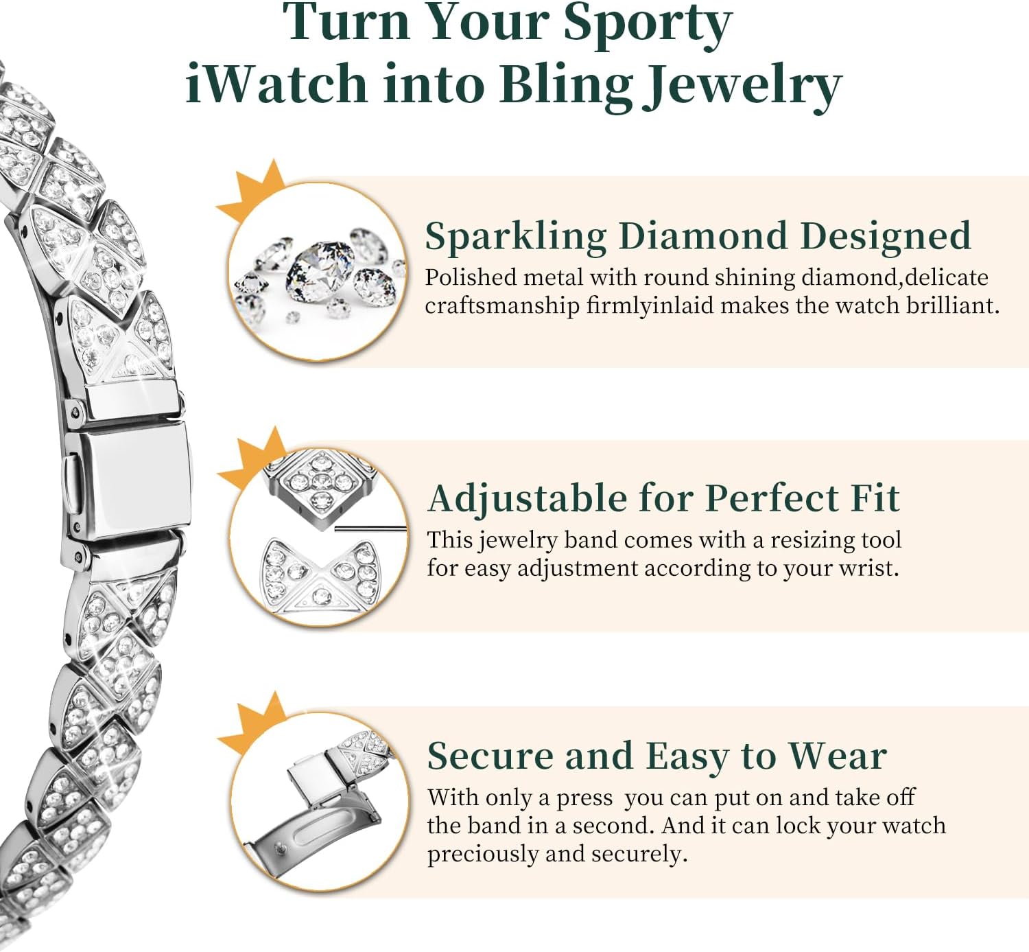 - Ausbleichsicher: Unser Apple Watch Silber Armband ist aus rostfreiem Stahl und unzähligen synthetischen Diamanten gefertigt, wodurch es leicht und angenehm zu tragen ist. Und das glänzende Goldarmband ist vakuumbeschichtet, um ein Anlaufen zu