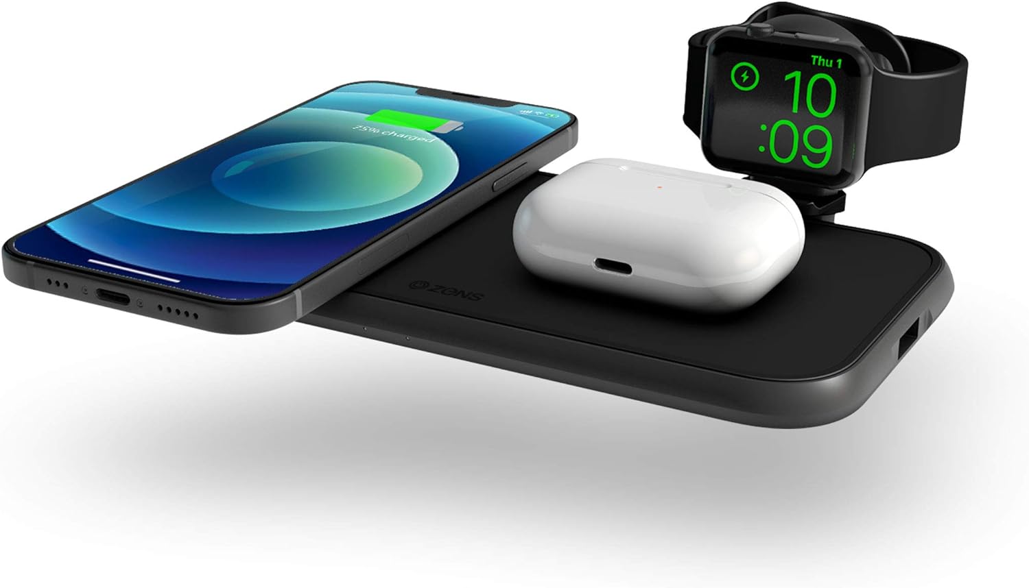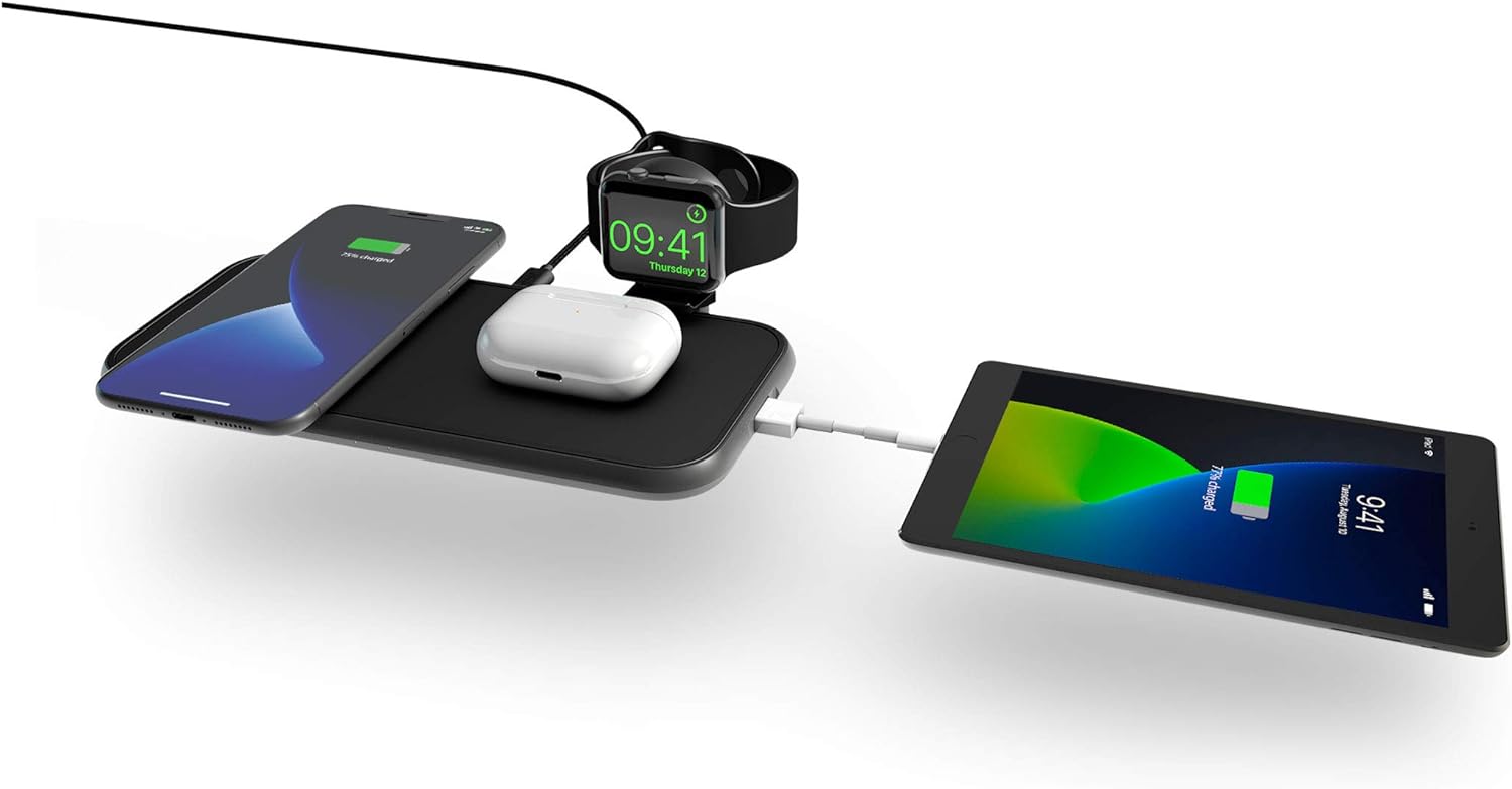 - Lädt bis zu 4 Geräte gleichzeitig: Zwei Qi-fähige Geräte + Apple Watch + ein beliebiges, weiteres Gerät über den eingebauten USB-A Anschluss