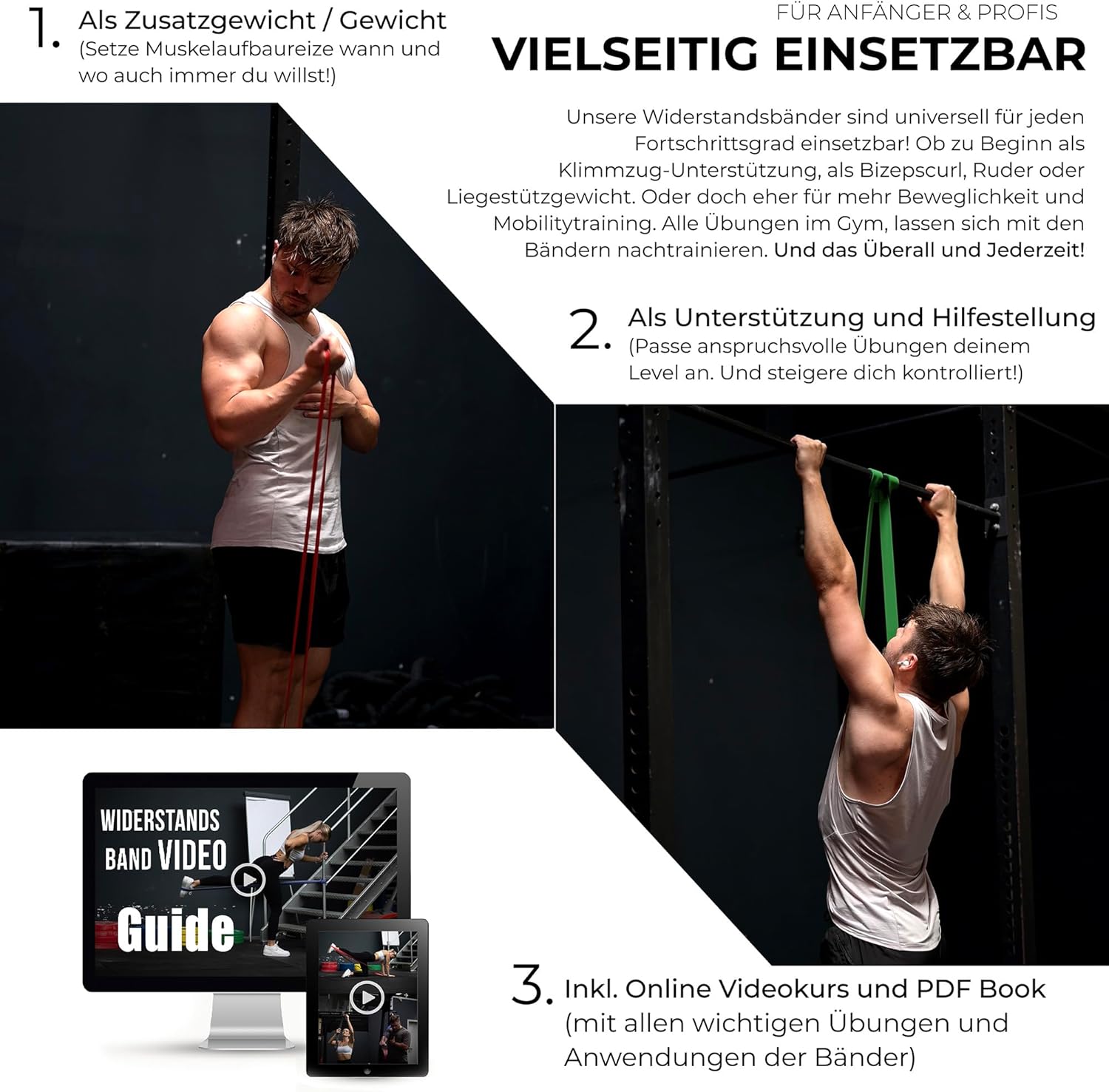 - MIT TRAININGS-GUIDE & BEUTEL- Die Trainingsbänder kommen in einer kleinen Tasche bei dir an und als PDF per E-Mail bekommst du deinen Workout-Guide! Hier zeigen wir dir viele coole Übungen für deine Gummi Bänder (Klimmzüge, Liegestütz, Squats und