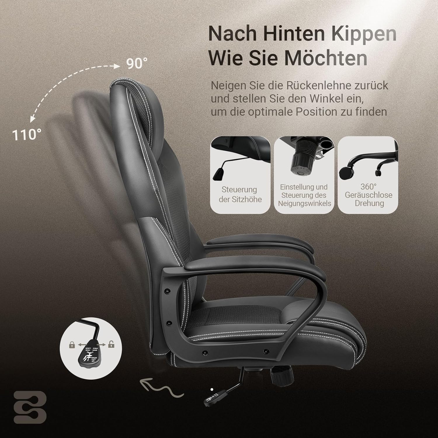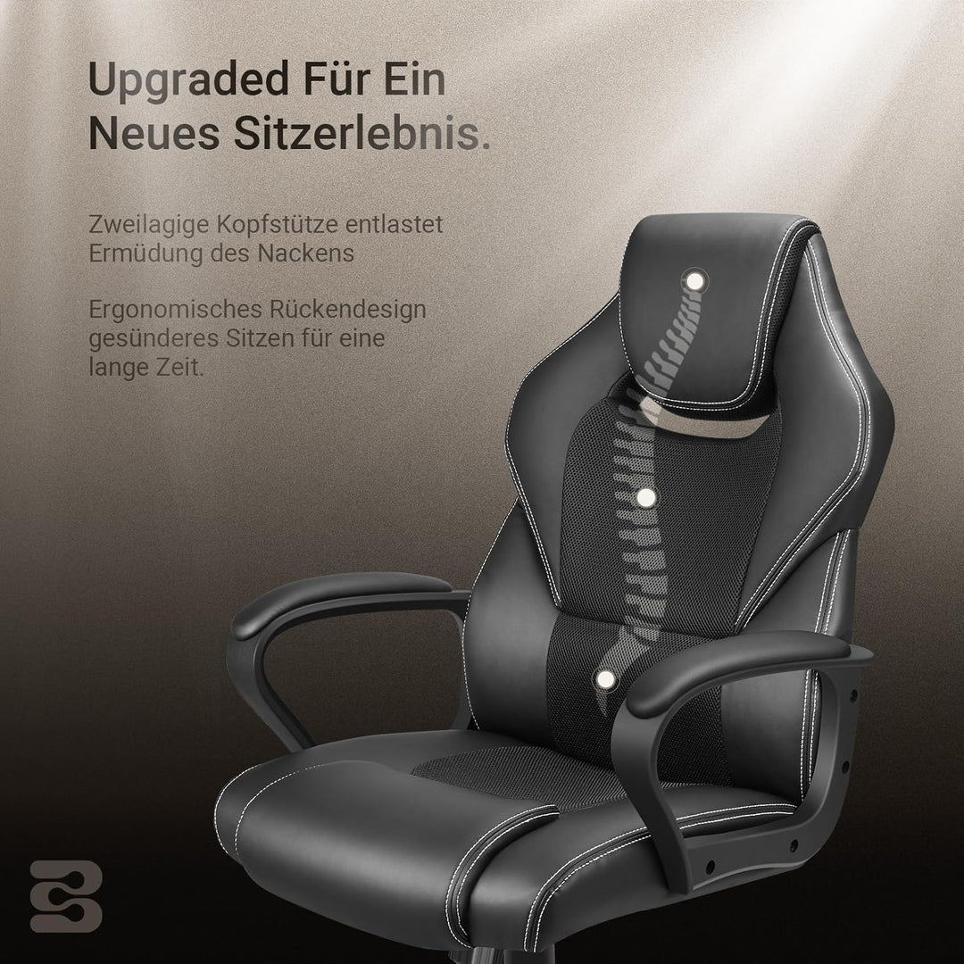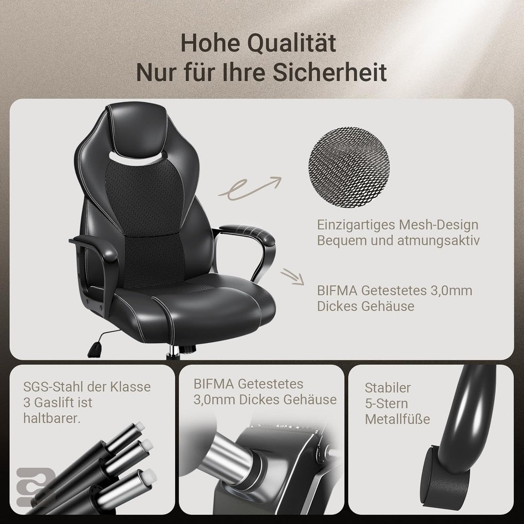 - Bequem und atmungsaktiv - Unser Bürostühle besteht aus hochdichtem Schwamm und hochwertigem PU-Leder, das mit strapazierfähigem, atmungsaktivem Netzgewebe bezogen ist. Hohe Luftdurchlässigkeit, egal ob im Winter oder im Sommer, bietet Ihnen ein angenehmes Sitzgefühl. Darüber hinaus bieten Ihnen die verdickte Nackenstütze und die gepolsterten Armlehnen einen hervorragenden Komfort für lange Arbeits- oder Unterhaltungsstunden.