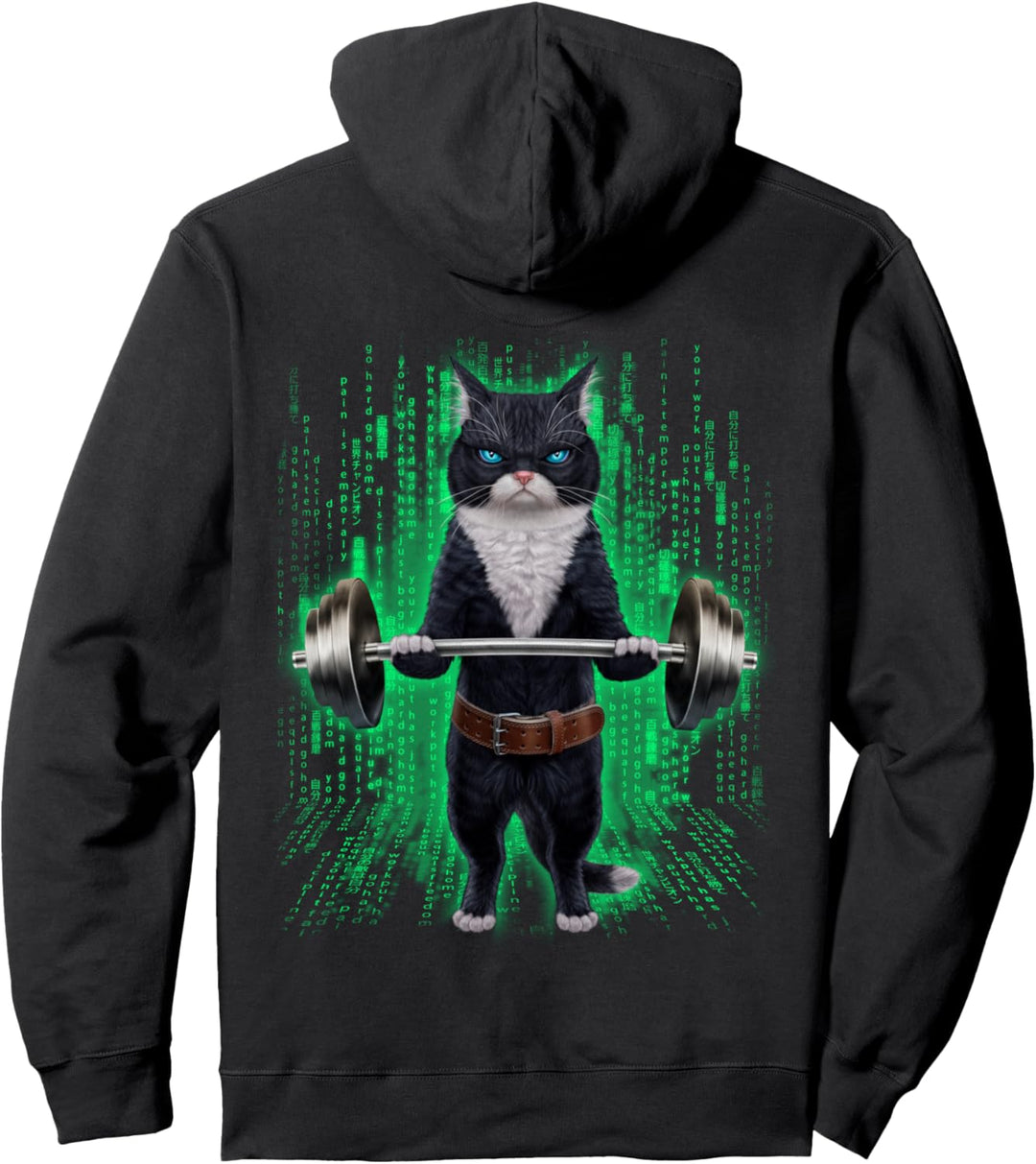 Bicolor Katze, die Gewichte im Cyber-Fitnessstudio hebt Pullover Hoodie