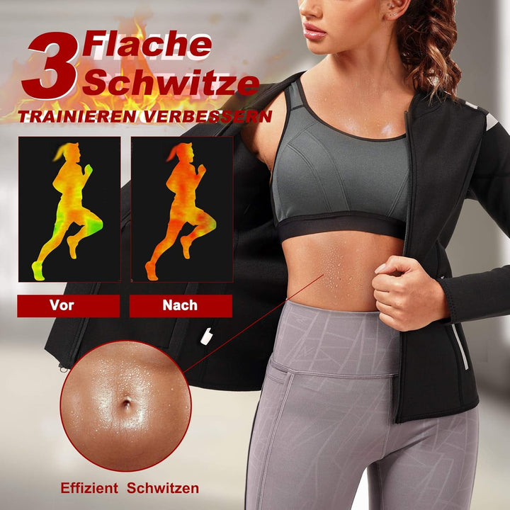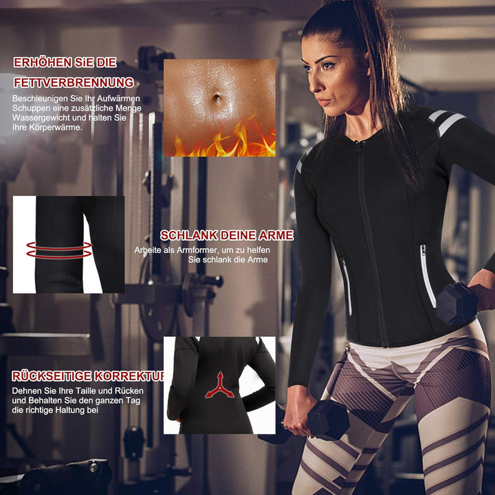 - ★ 【3-MAL MEHR SCHWEISS EFFEKT】Das Damen Abnehmen Training Korsett Bauchweg Schwitzjacke aus hochwertigem Neoprengewebe fördert die Durchblutung, hält den Oberkörper warm, erwärmt Körper und Arme, erhöht die Körpertemperatur beim Fitnesstraining, lässt Sie wie verrückt schwitzen, beschleunigt die Kalorienverbrennung, reduziert Das Fett von Bauch, Taille, Rücken und Arm, kombiniert mit einer gesunden, schlanken Ernährung und mehr Wasser für einen schnellen.