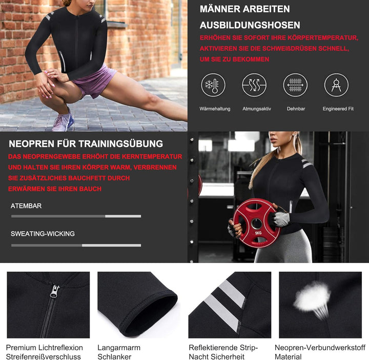- ★ 【KOMFORTABEL WORKOUT LANGE ÄRMEL SCHWITZJACKE 】Dieses Damen Sauna Fitness lange Ärmel Neopren Training Shirt shemd besteht aus hochwertigem Verbundstoff, Mittelteil 100% Neopren, innerem und äusserem 100% Polyester, so dass dieser bauchweg Body Shaper super strekthy und langlebig ist. Es hilft, die Wärme in Ihrem Körper zu speichern, sobald der Reissverschluss geschlossen ist. Und dahinter befindet sich eine Schutzschicht, die Ihre Haut schützt. Bequem genug, um sie im normalen Alltag zu tragen.
