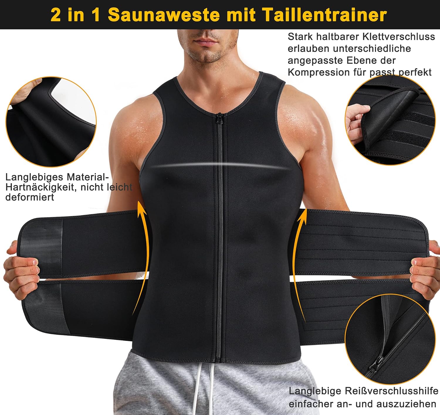 - ✔ BEST BAUCHWEGGÜRTEL FÜR FITNESSTRAINING: Der Neopren Sauna gürtel für brennendes Bauchfett für Männer mit Taillentrainer ist ein Modell mit vollständiger Weste, das auf Ihren Kernbauchbereich abzielt, sowie ein verstellbarer äusserer Gürtel, der Ihre thermogene Energie und Ihren flachen Bauch erhöht, um Ihnen zu helfen, intensiven Schweiss aufzubauen und Pfund effizienter abzunehmen. Erhöht es die Ausscheidung von Giftstoffen und den lokalen Fettkatabolismus.