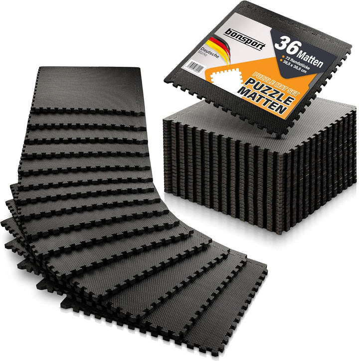 - LIEFERUMFANG: 36 Bodenschutzmatten á 38,5 x 38,5 x 1,0 cm inkl. Randstücke. Farbe schwarz. Material EVA Schaumstoff, wasserfest, wärmeisolierend, wirkt schalldämpfend und stossdämpfend und ist langlebig. Gesamtfläche ca. 5,19 m²