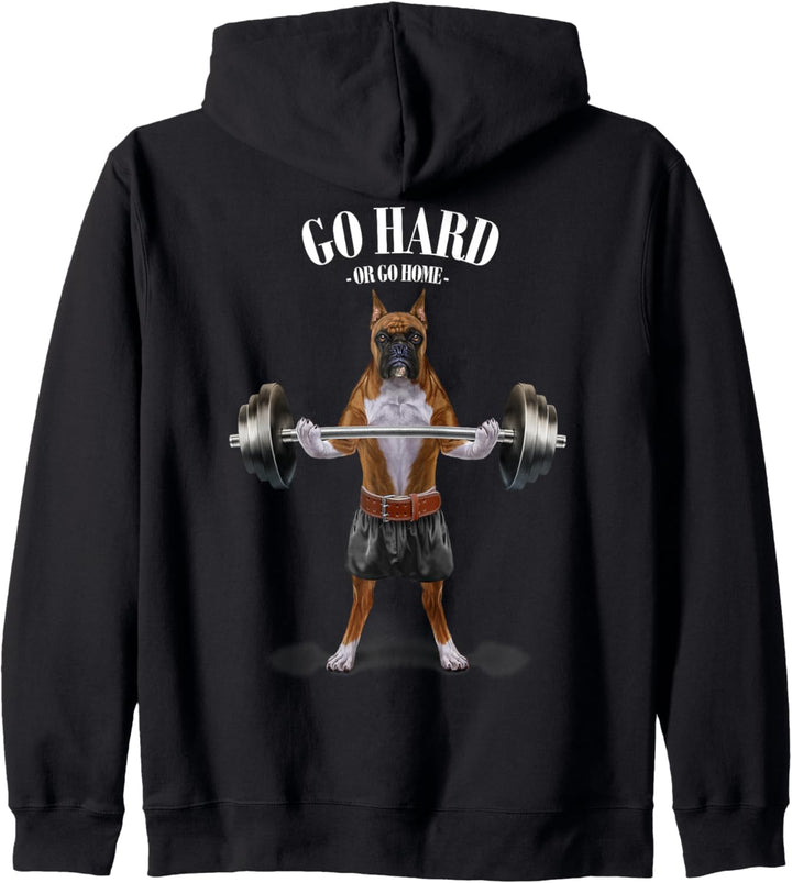 Boxerhund, der Gewichte im Fitnessstudio hebt Kapuzenjacke