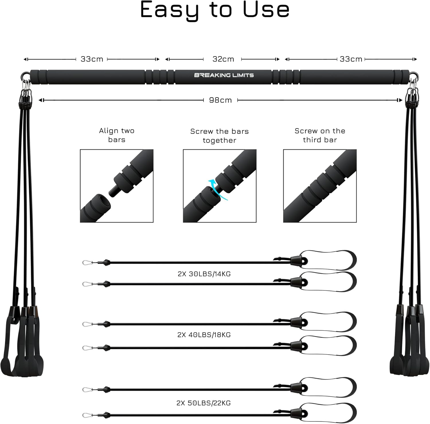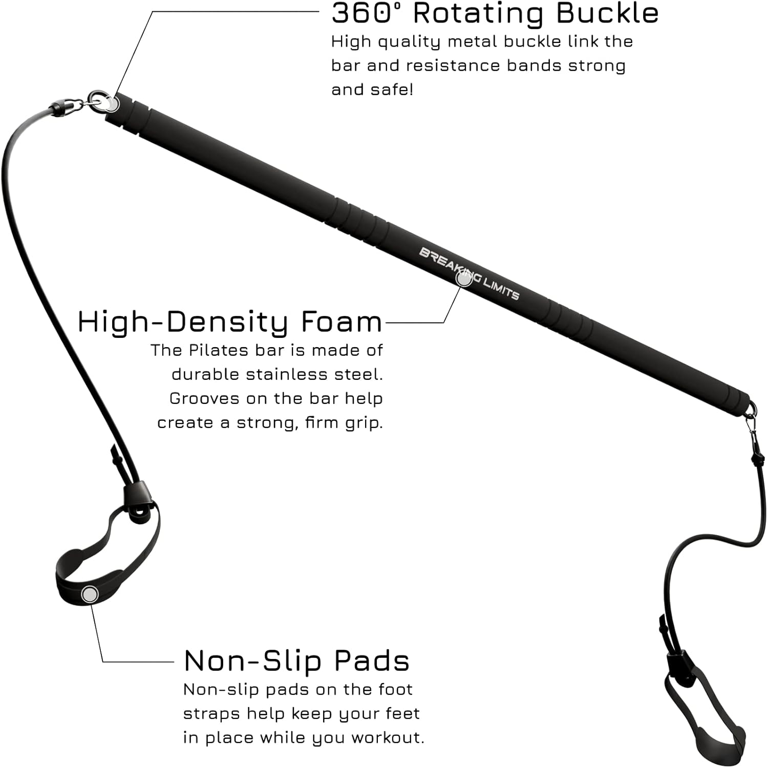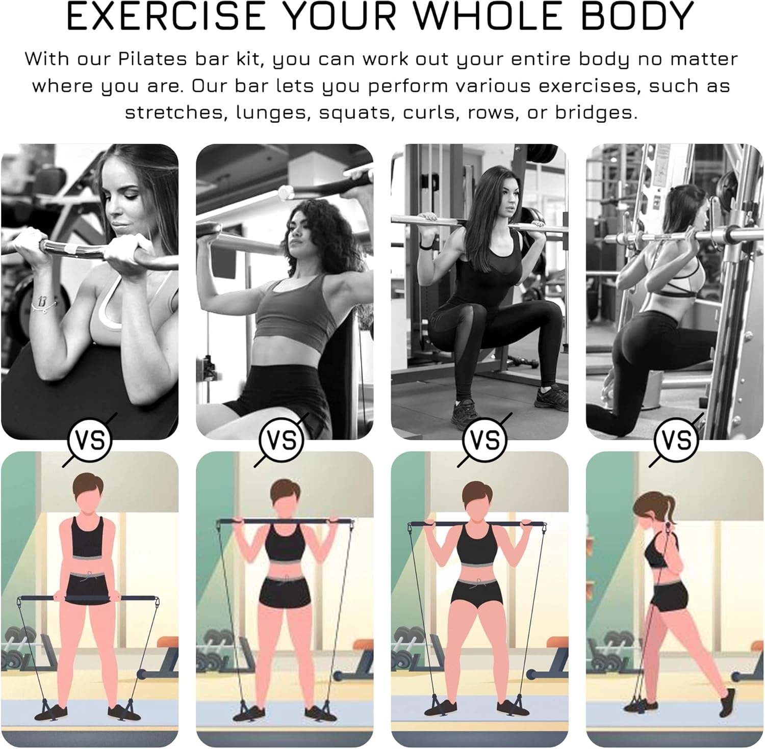 - 💪 Ganzkörper Training Zuhause oder Unterwegs - Mit unserem Pilates Set lässt sich Ihr ganzer Körper trainieren, egal wo Sie sind. Mit dieser Trainings-Stange können Sie Dehnungen, Ausfallschritte, Kniebeugen, Curls, Rudern oder Brücken ausführen.