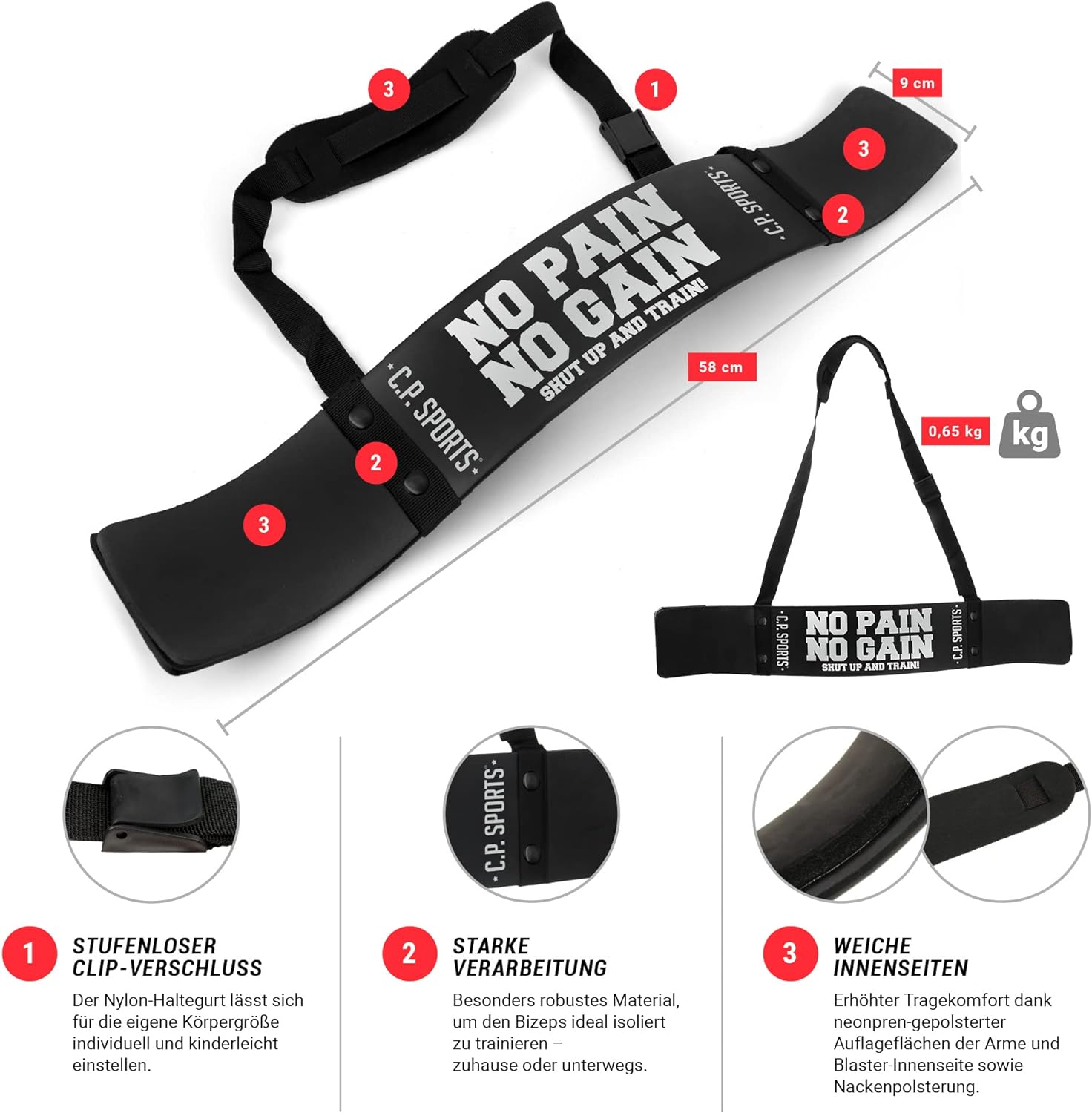 - Masse: Länge ca. 58 cm, Breite ca. 9 cm - Farbe: schwarz mit No Pain No Gain Schriftzug - Lieferumfang: 1 C.P. Sports Bizeps-Blaster