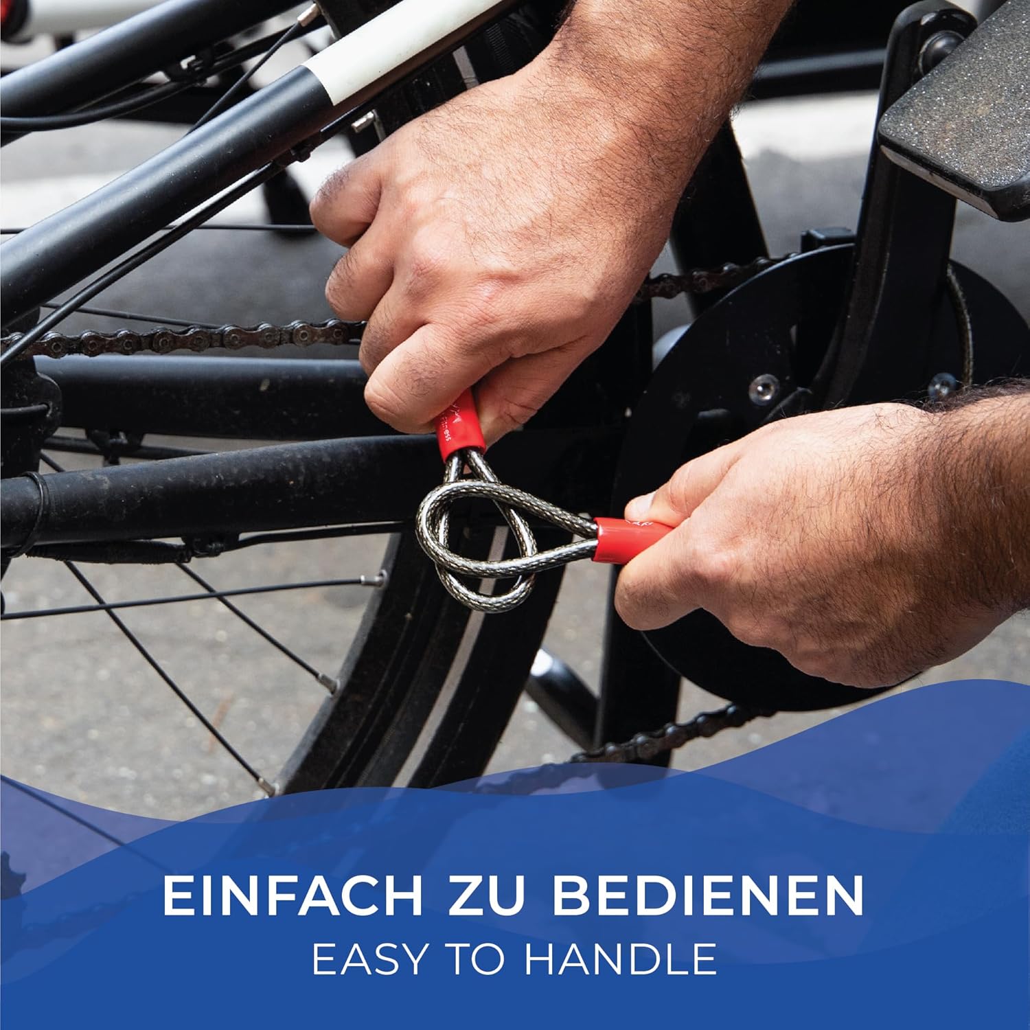 - DIEBSTAHL SCHUTZ - Gemeinsam mit einem Vorhänge-, Bügel- oder Discschloss bietet das Fahrradseil optimalen Schutz. Es kann auch gemeinsam mit einem Bügelschloss als Zusatzsicherung genutzt werden.