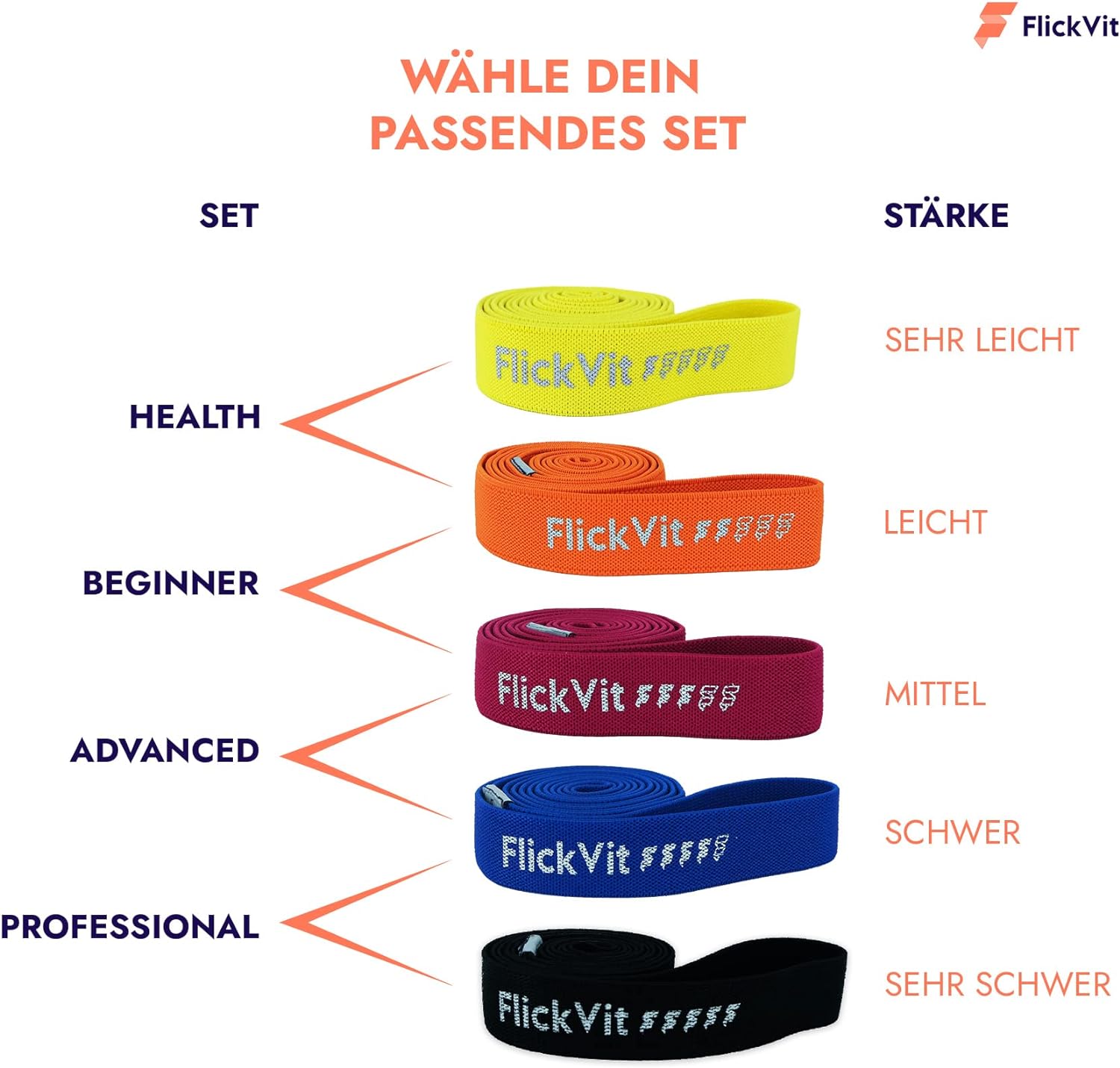 - 【ÖKOLOGISCH, HYGIENISCH, ROBUST】Das ökozertifizierte FlickVit Widerstandsband Set ist aus hochwertigem Stoff und viel robuster als andere Latex Gummi Fitness Band Sets. Die Übungsbänder sind bei 30°C waschbar und weich, aber dennoch sehr robust.