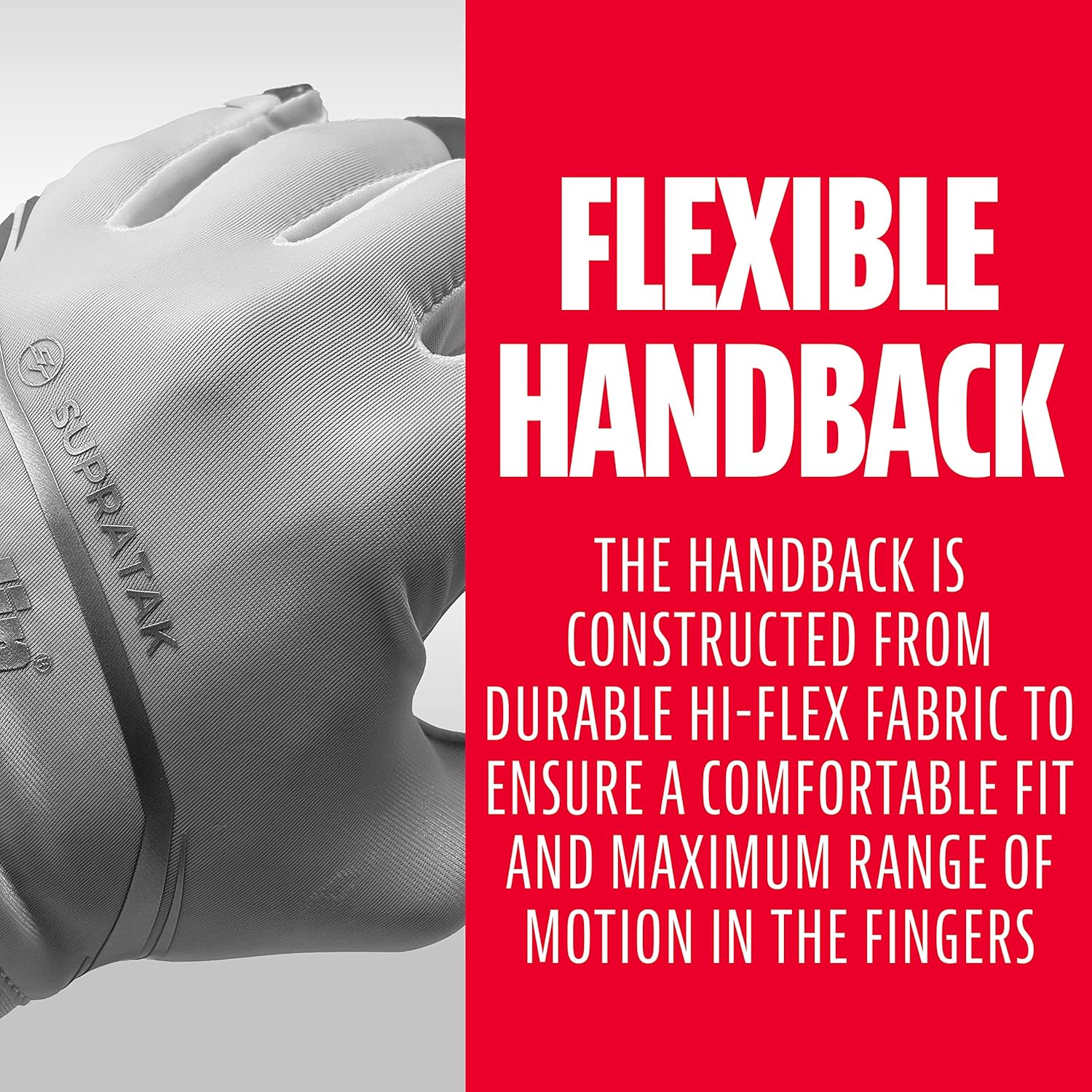 - Flexible Handrücken: Der Handrücken ist aus strapazierfähigem Hi-Flex-Gewebe hergestellt, um eine bequeme Passform und maximale Bewegungsfreiheit in den Fingern zu gewährleisten