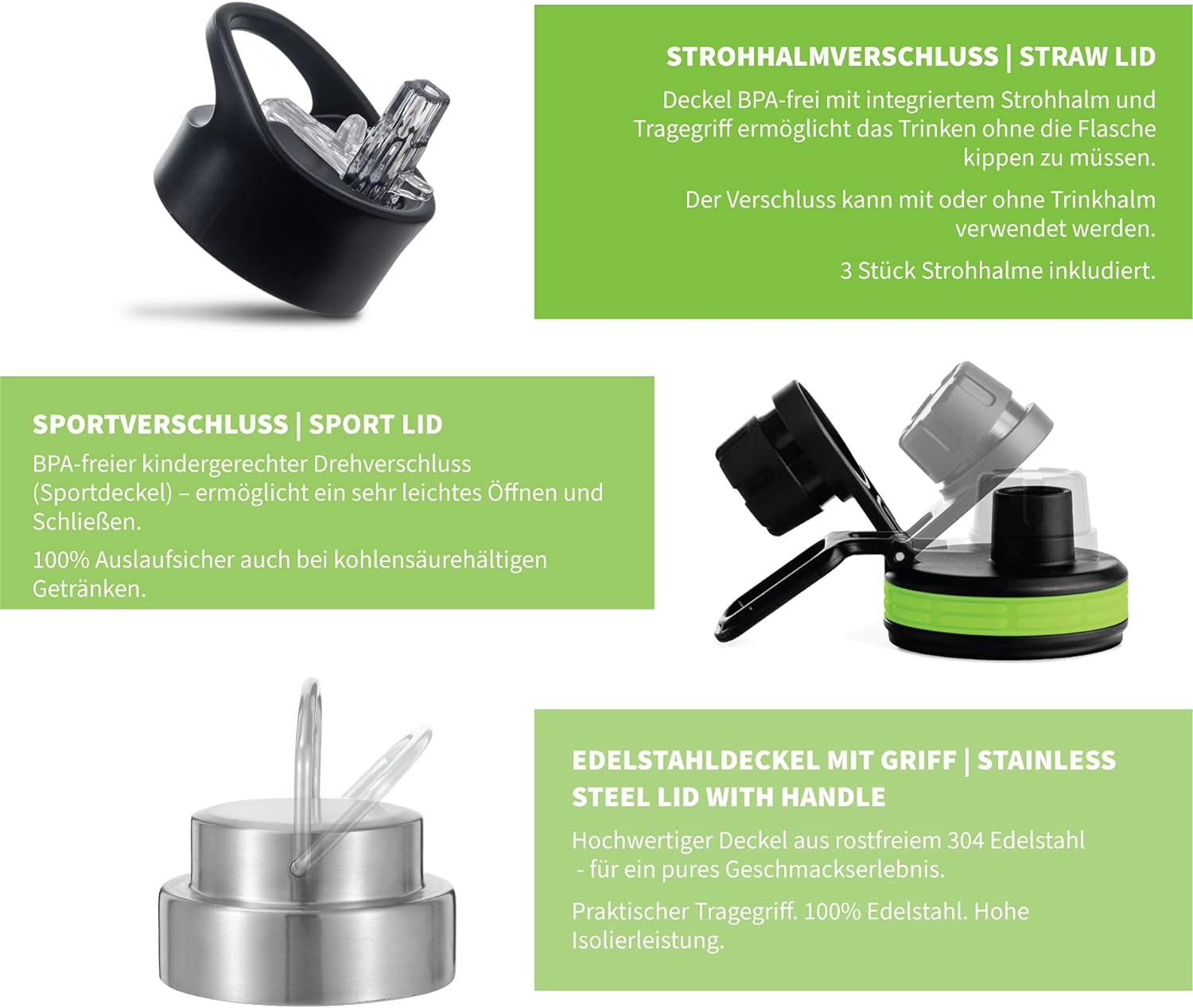 - 💦 PURES TRINKERLEBNIS: Die Trinkflaschen liegen mit ihrer griffigen Oberfläche sehr gut in der Hand, die auswechselbaren Deckel sind sehr einfach und sicher zu bedienen. Deine Getränke bleiben bis zu 24 Stunden kalt & bis zu 12 Stunden heiss.