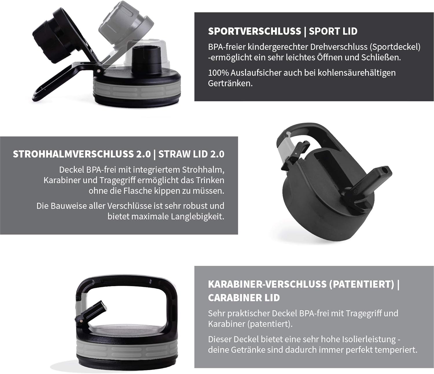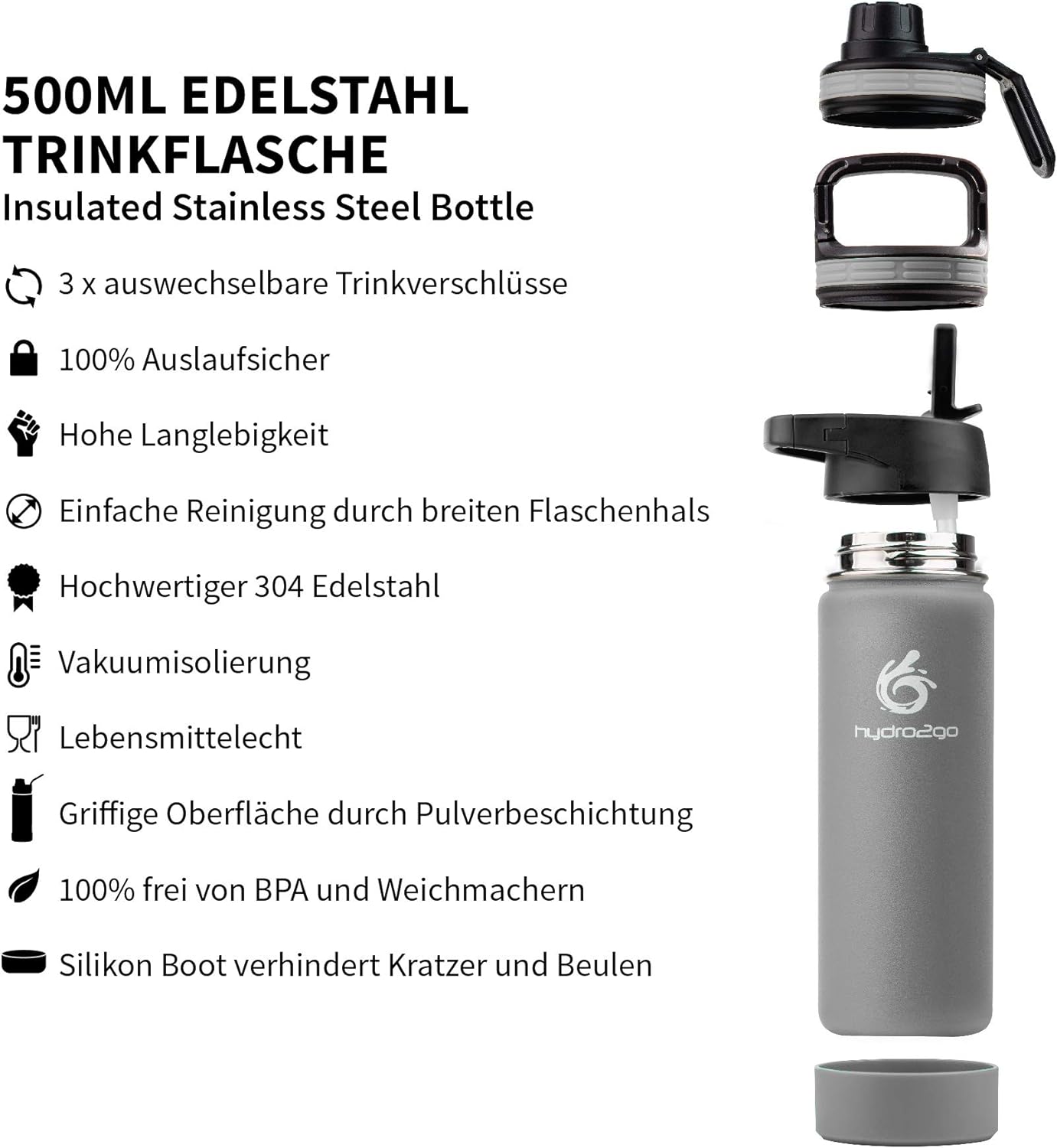 - ✅ 3 PRAKTISCHE DECKEL: Die im Lieferumfang enthaltenen Deckel sind mit allen Edelstahl Trinkflaschen von hydro2go kompatibel: 1. Dynamischer Sportverschluss 2. Trinkverschluss mit Strohhalm (straw lid) 3. Patentierter Karabinerverschluss. Die