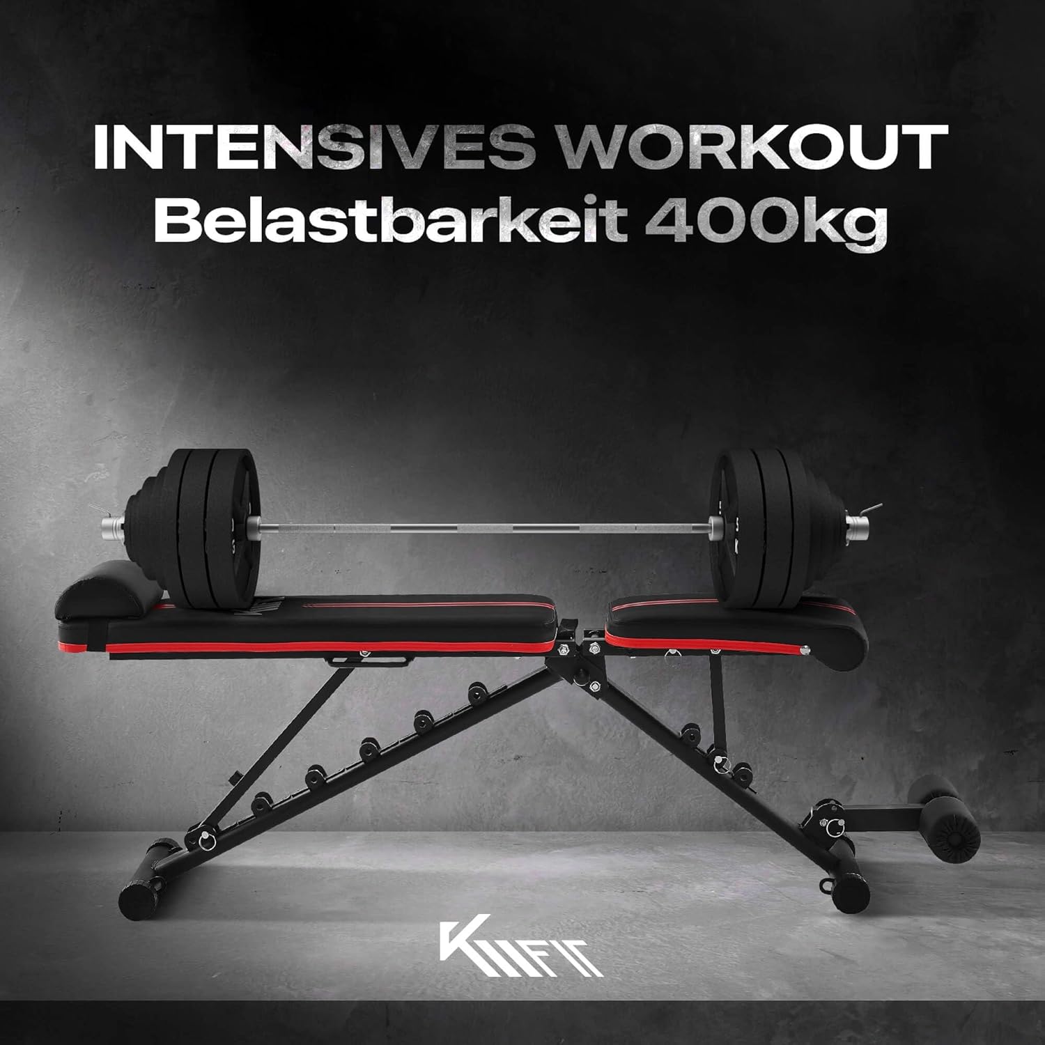 - [Multifunktional] Die Hantelbank von KM-Fit ermöglicht dir ein umfangreiches Trainingsprogramm. Bei den Übungen sind keine Grenzen gesetzt. Trainiere mit deinem eigenen Körpergewicht oder den mitgelieferten Zugbändern. Kombiniere die Hantelbank mit