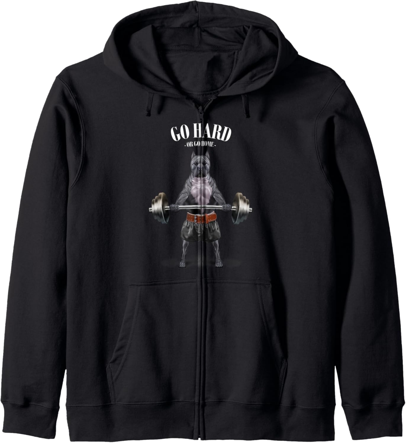 Pitbull-Terrier-Hund, der Gewichte im Fitnessstudio hebt Kapuzenjacke