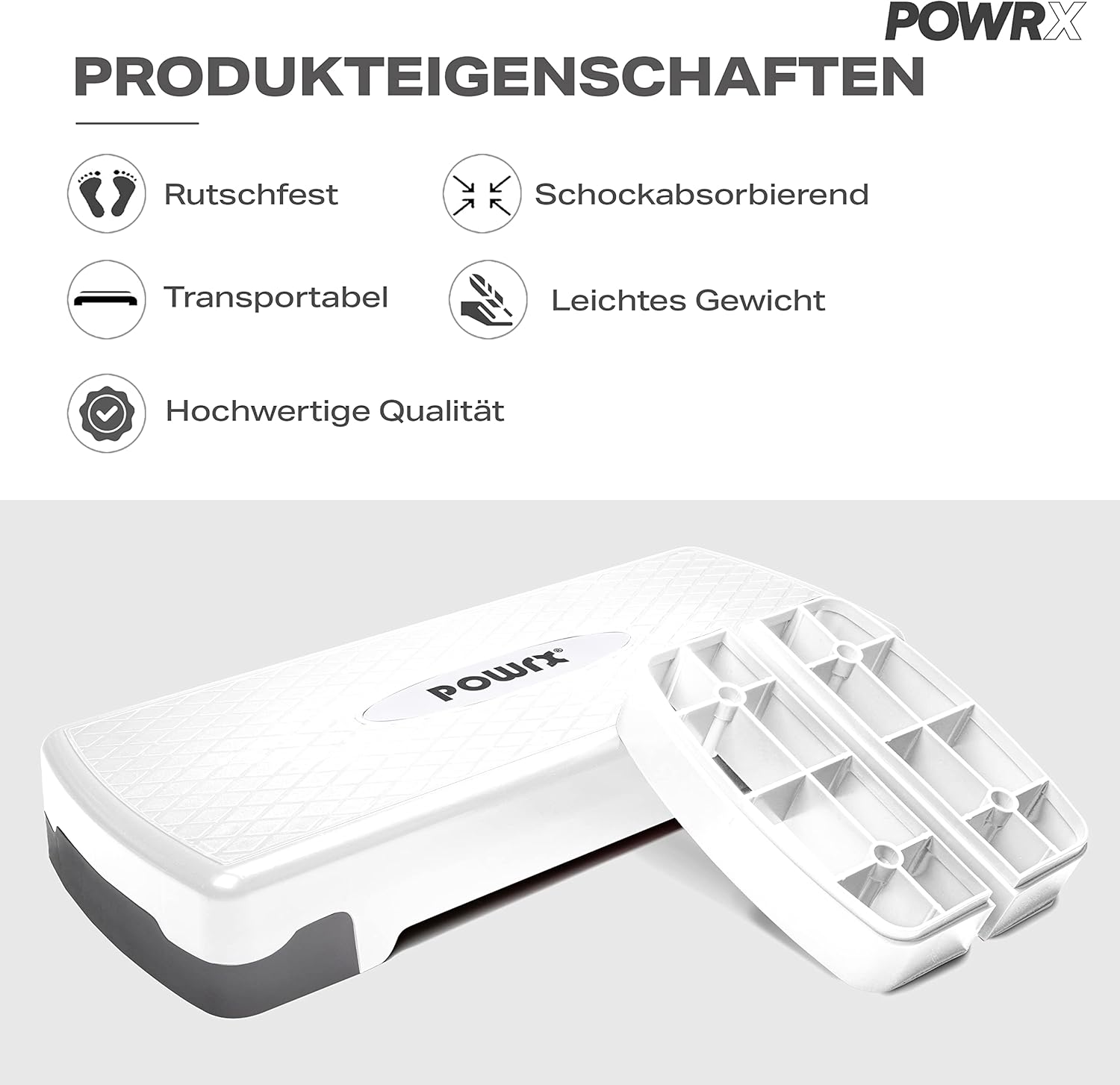 - Produkteigenschaften - Mit dem höhenverstellbaren Steppbrett von POWRX kann die Intensität des Trainings erhöht oder auch reduziert werden. Somit ist ein individuelles Anpassen an den jeweiligen Trainingsstand problemlos möglich. Daher können sowohl Anfänger als auch Fortgeschrittene gut zusammen trainieren! Die Höhe lässt sich 2-fach verstellen (von 10 cm / 15 cm) | Maximales Benutzergewicht: 100 kg