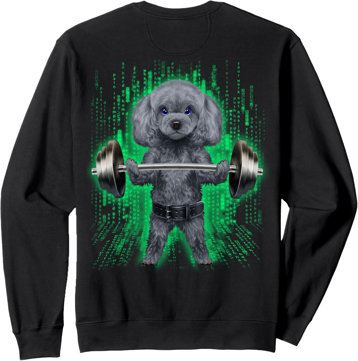 Pudelhund, der Gewichte im Cyber-Fitnessstudio hebt Sweatshirt