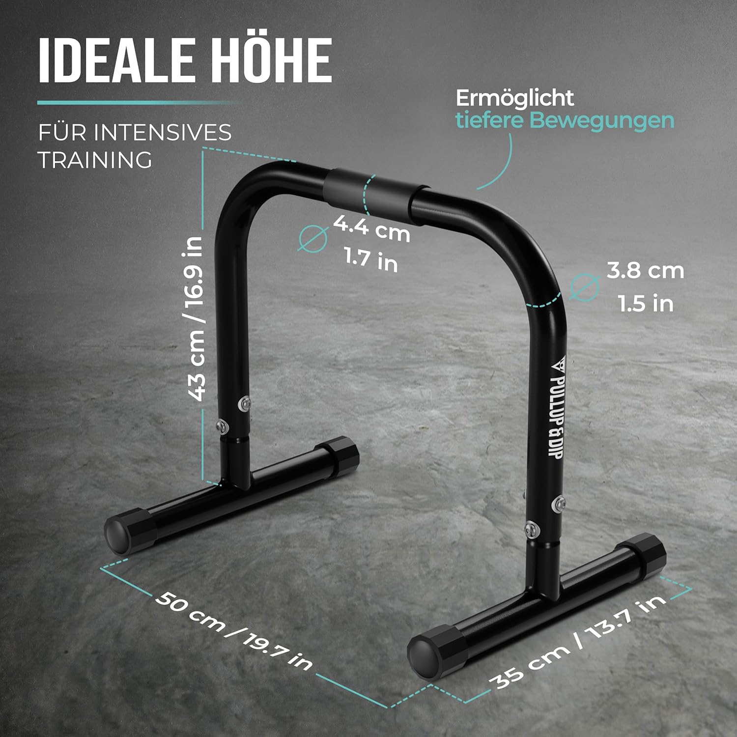 - ✅ INKL. ÜBUNGSGUIDE MIT 37 ÜBUNGEN: Inkl. Übungsguide mit 37 Parallettes Übungen als eBook. Produktdetails: Griff Durchmesser: 3,8 cm (mit Gummi 4,4 cm); Farbe: schwarz; Masse: 50 cm x 35 cm x 43 cm; Material: Stahl; Max. Benutzergewicht: 120 kg; Gewicht: 5,6 kg; vollständig demontierbar