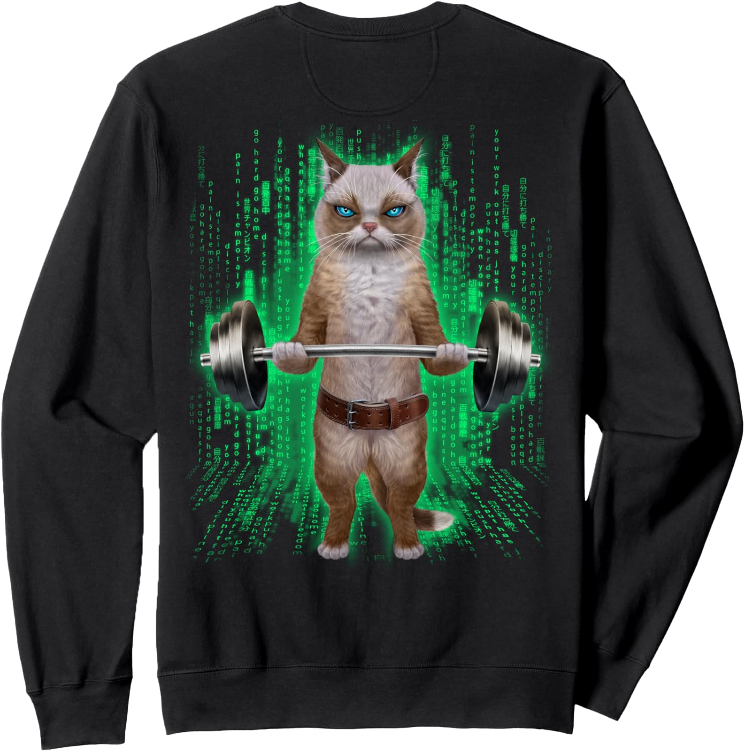 Ragdoll Katze, die Gewichte im Cyber-Fitnessstudio hebt Sweatshirt