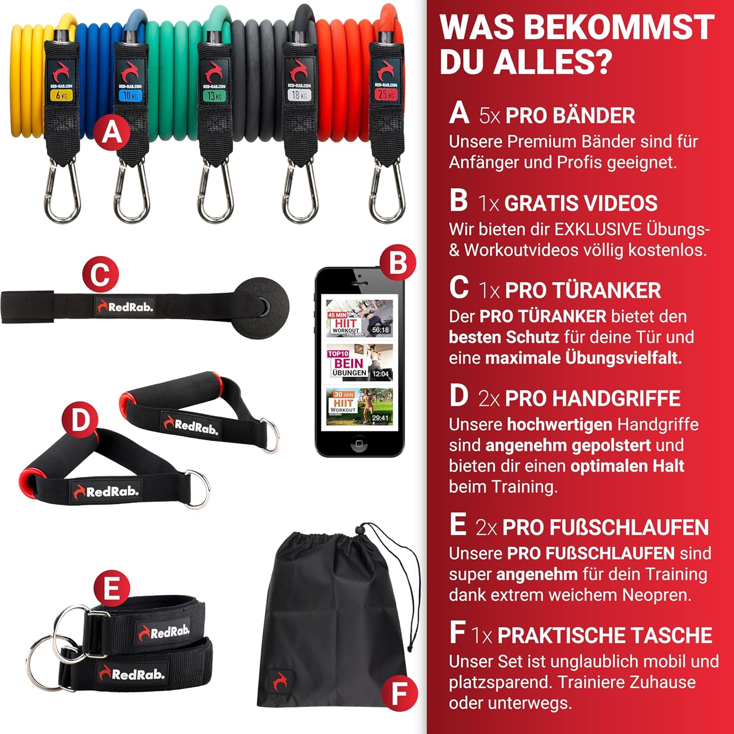 - ✅ 𝗛𝗢𝗖𝗛𝗪𝗘𝗥𝗧𝗜𝗚𝗘𝗦 𝗦𝗘𝗧: Unser Fitnessbänder Set umfasst 5 langlebige Widerstandsbänder unterschiedlicher Widerstandsstufen (10-50 lbs) aus 100% Naturlatex. Nutze eines oder mehrere der Latex Resistance Bands bis zu einem Widerstand von 150 lbs (68 kg). Zusätzlich erhältst du 2 Griffe, 2 Fussschlaufen, 1 Türanker, 1 Tasche und Videos für dein Home Workout.