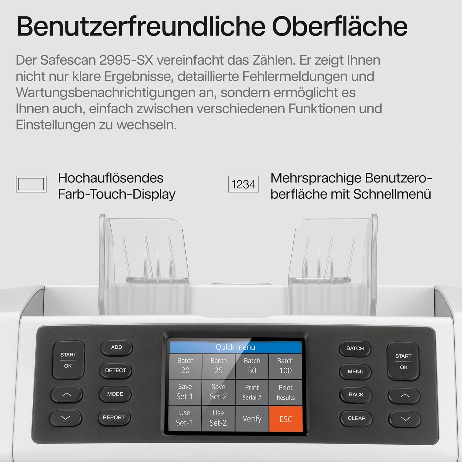 - PREMIUM-FÄLSCHUNGSERKENNUNG: Der Safescan 2995-SX bietet Ihnen vollständige Sicherheit. Innerhalb von Sekunden scannt er Ihre Banknoten auf bis zu sieben Sicherheitsmerkmale, einschliesslich ultravioletter Tinte, Infrarot-Tinte, magnetischer Tinte,