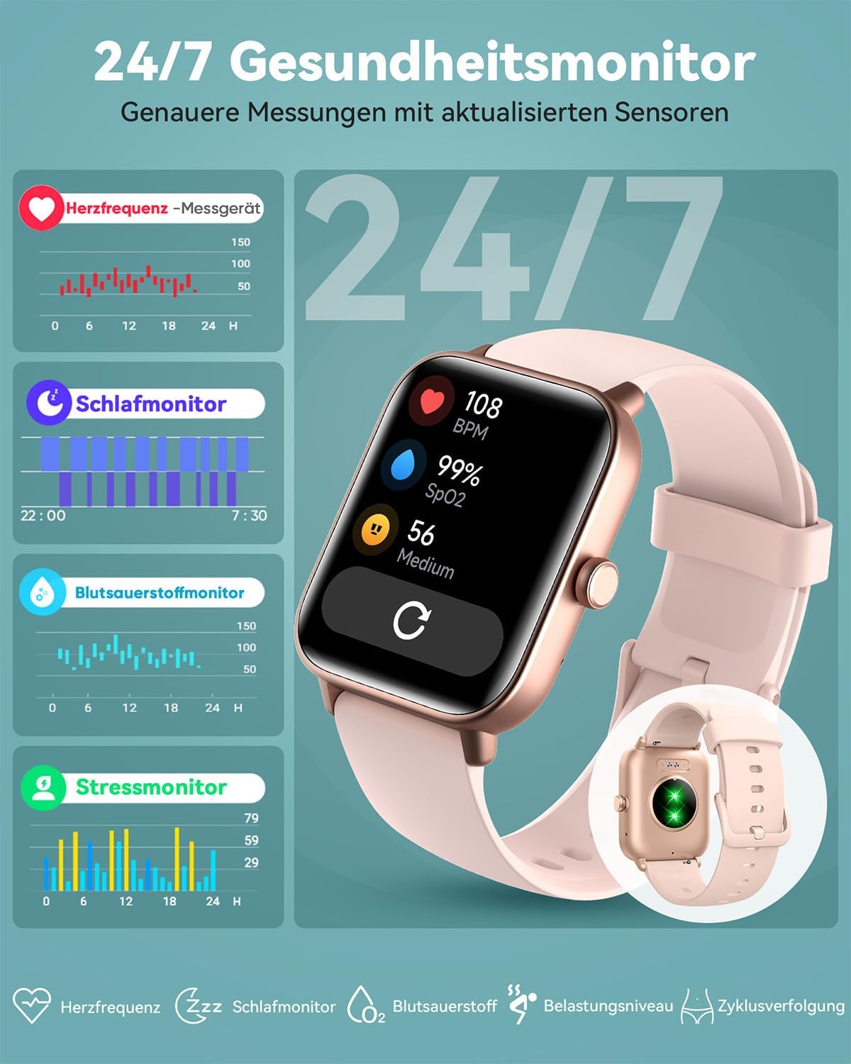 - 💖【24 Stunden Gesundheitsüberwachung】Smartwatch für damen verwendet fortschrittliche Sensoren für präzise Überwachung. Es ist ein guter Helfer für Sie, gesund zu bleiben. Sie kann Ihre Gesundheitsdaten (SpO2, Herzfrequenz,Stress)