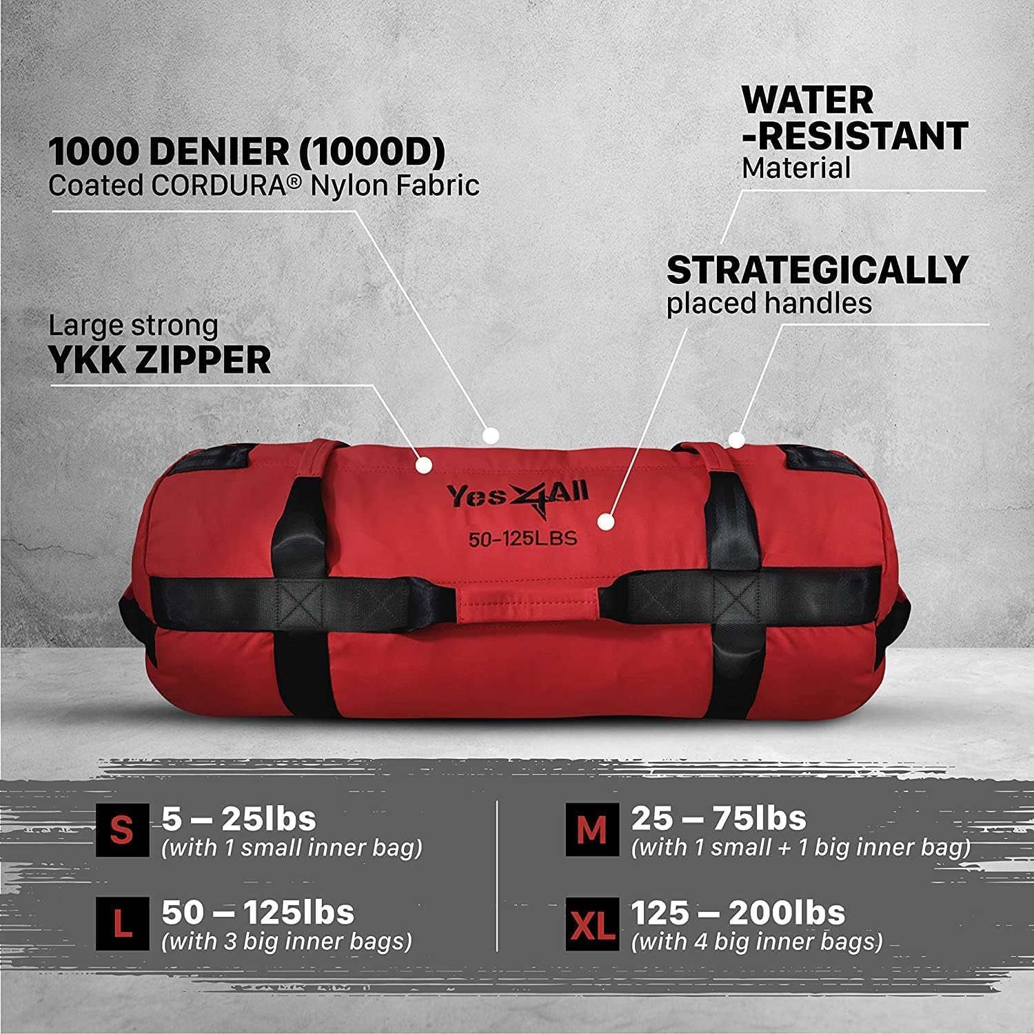 - JUST THE RIGHT SANDBAG: Yes4All Sandsäcke sind in verschiedenen Farben und Kapazitäten erhältlich, so dass Sie genau den Sack wählen können, der zu Ihrem Fitnesslevel und Ihren Trainingszielen passt: S (2 – 11 Kg), M (11 – 34 Kg), L (34 – 56