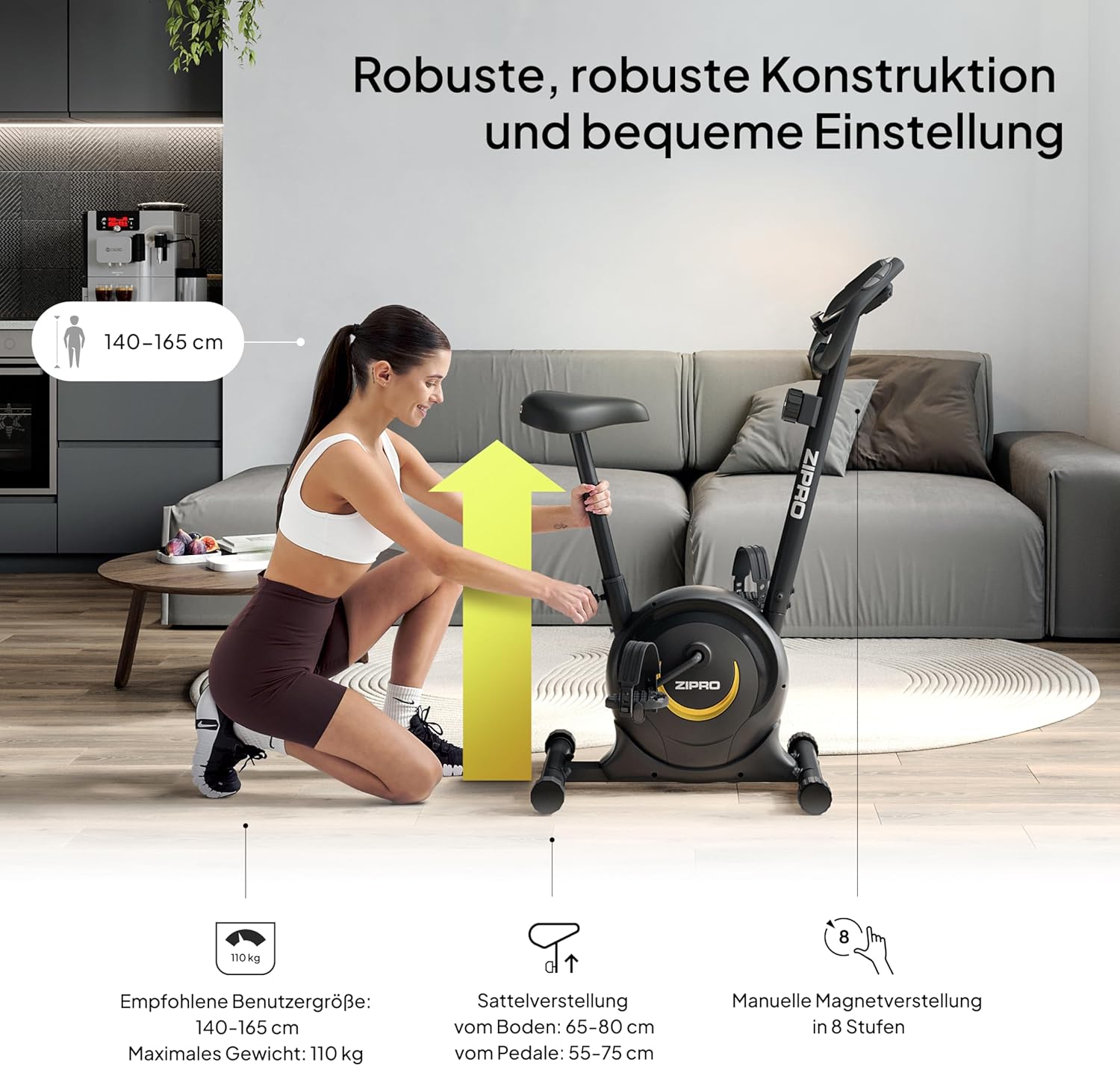 - Unabhängig von Ihrer Grösse oder Ihrem Erfahrungslevel ermöglicht das Fahrrad individuelle Widerstandseinstellungen und Sattelhöhen.