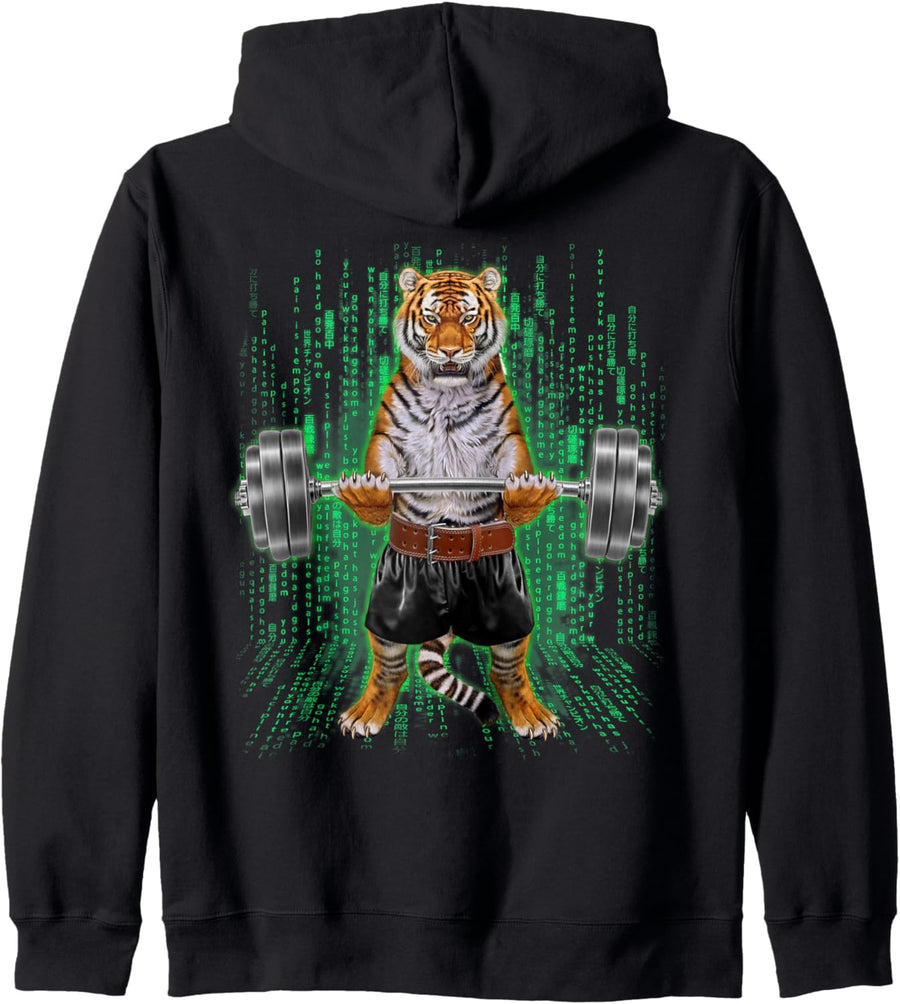 Tiger, der Gewichte im Cyber-Fitnessstudio hebt Kapuzenjacke