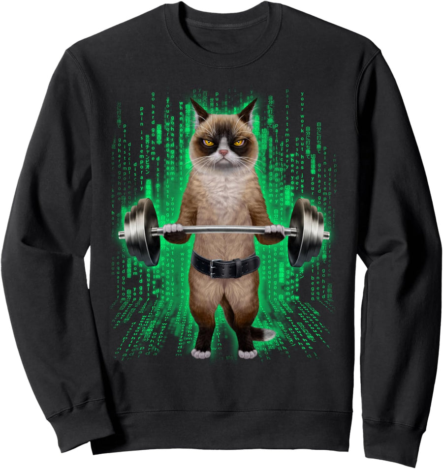 Siamesische Katze, die Gewichte im Cyber-Fitnessstudio hebt Sweatshirt
