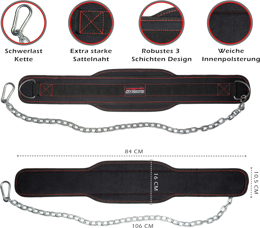 Raigeki Fitness Dip Gürtel mit Kette, 106cm Stahlkette, (+ Trainingspläne) - Gewichte Gürtel für Kra