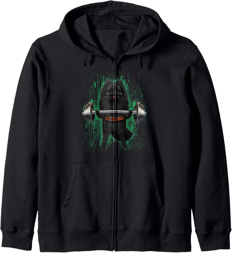 Pommerscher Hund, der Gewichte im Cyber-Fitnessstudio hebt Kapuzenjacke