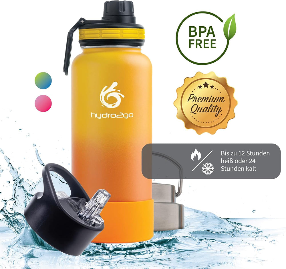 hydro2go ® Trinkflasche aus Edelstahl 1000 ml / 1 Liter - für Sport, Fitness & Outdoor | Thermo Edel