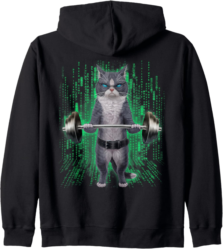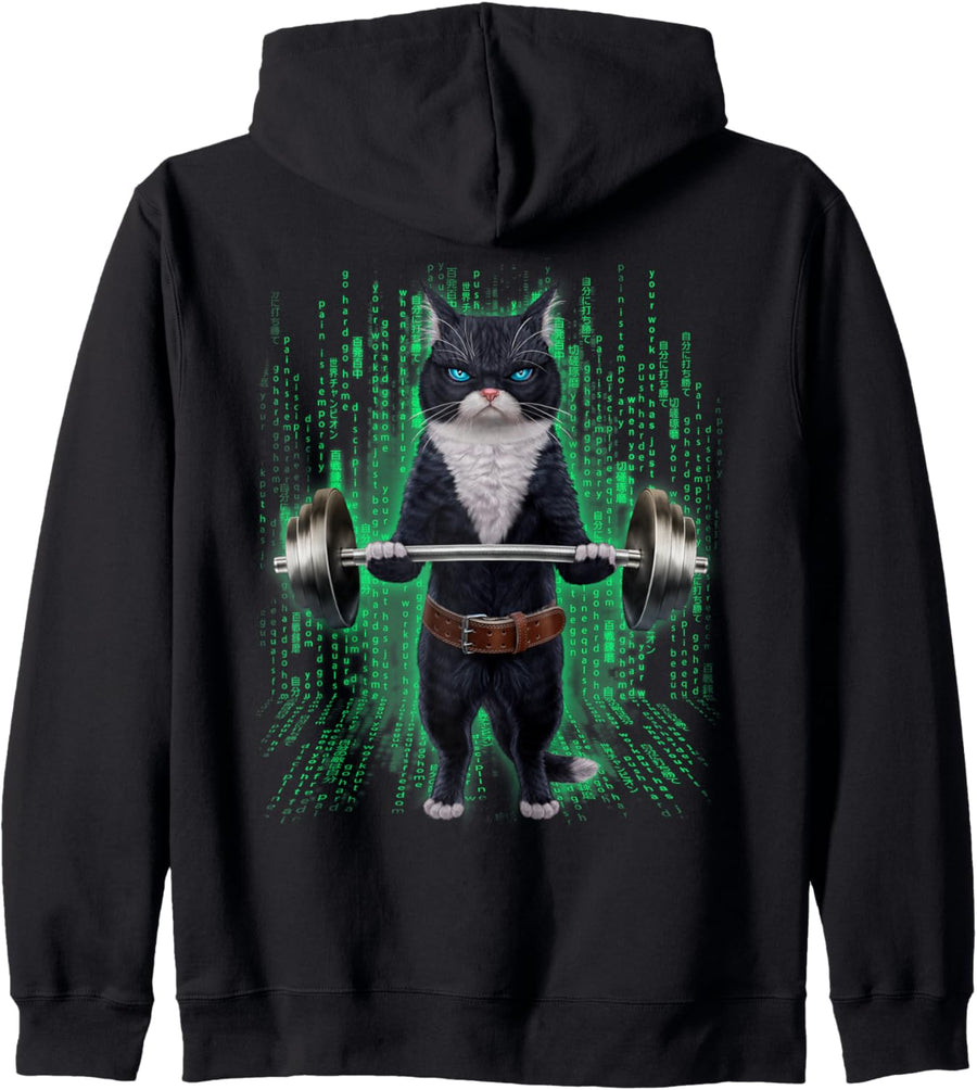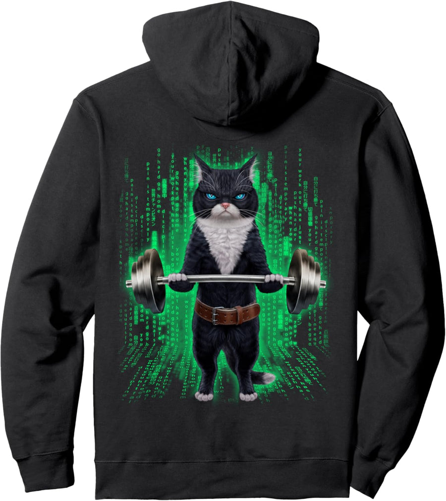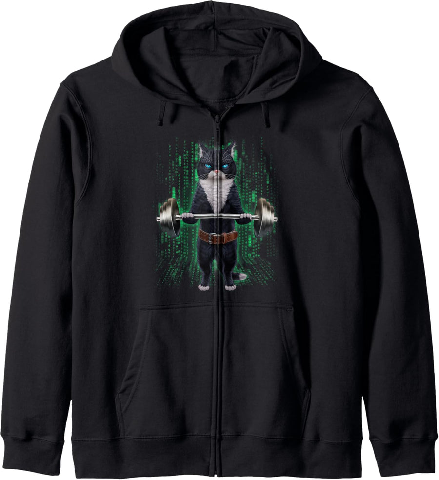 Bicolor Katze, die Gewichte im Cyber-Fitnessstudio hebt Kapuzenjacke