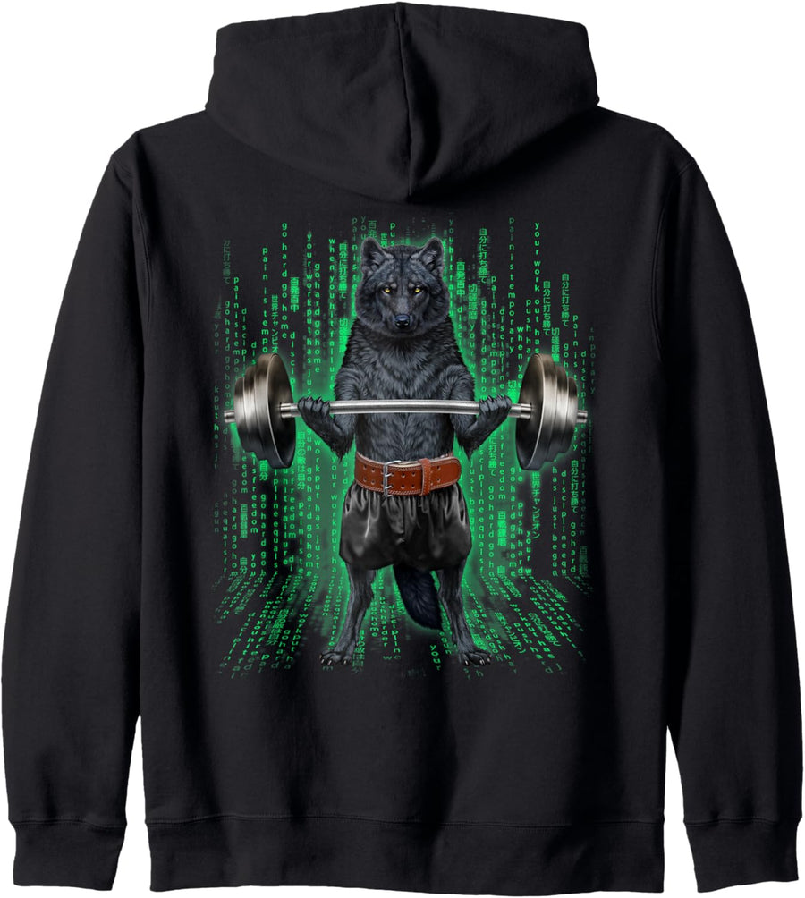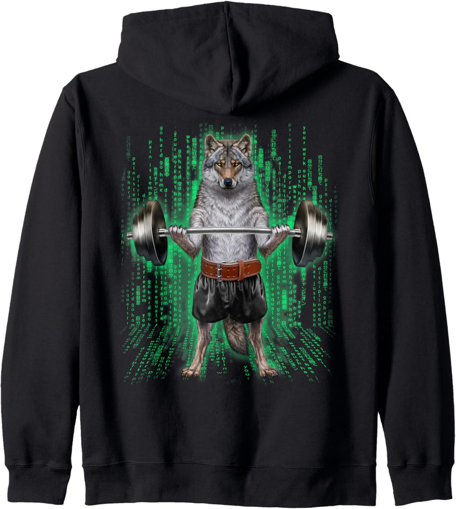 Wolf, der Gewichte im Cyber-Fitnessstudio hebt Kapuzenjacke