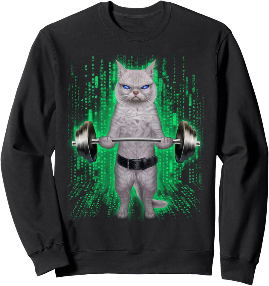 Weisse Katze, die Gewichte im Cyber-Fitnessstudio hebt Sweatshirt