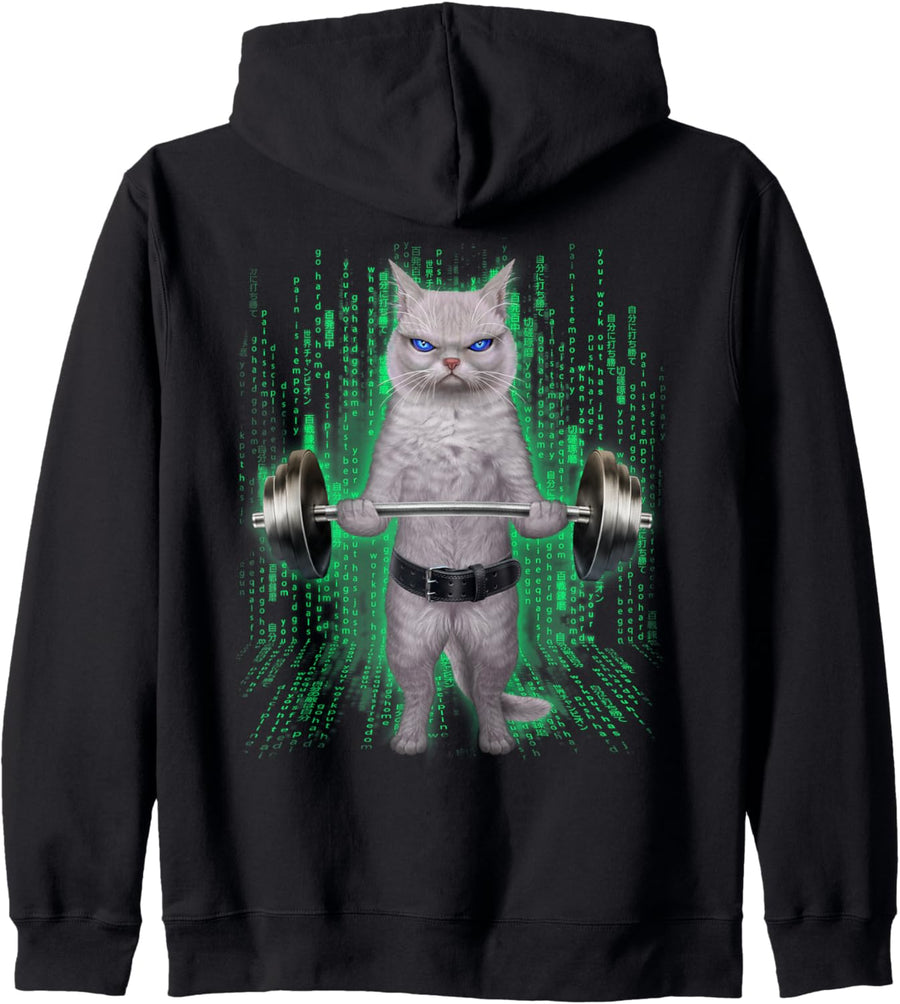 Weisse Katze, die Gewichte im Cyber-Fitnessstudio hebt Kapuzenjacke