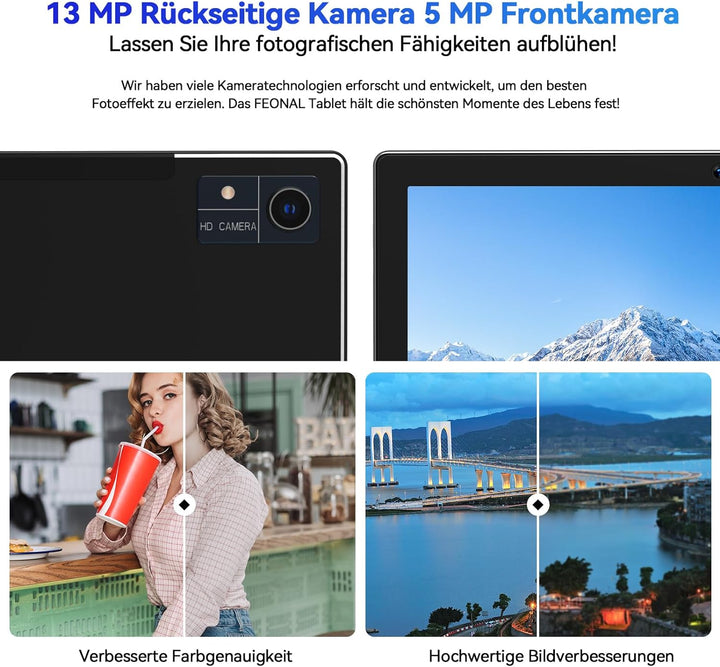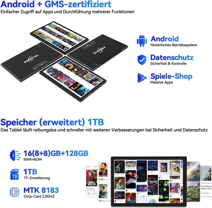 - 🐱🏍16GB RAM + 128GB ROM + 1TB Erweiterung: Das Tablet 10 zoll verfügt über 8GB RAM, die in den Einstellungen auf bis zu 16GB erweitert werden können.Ob Sie ein Spiel spielen oder an einer Aufgabe arbeiten, das FEONAL Android 12 Tablet liefert