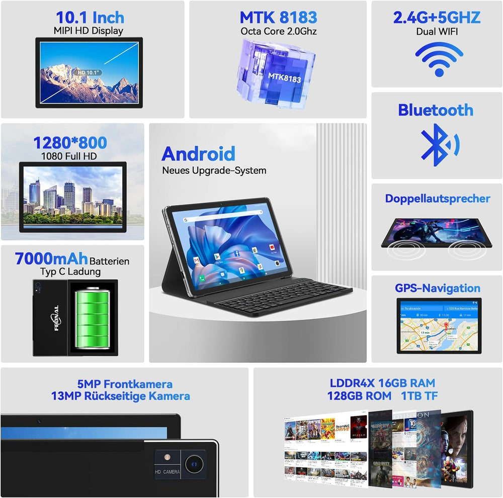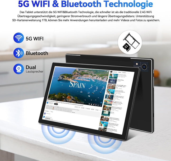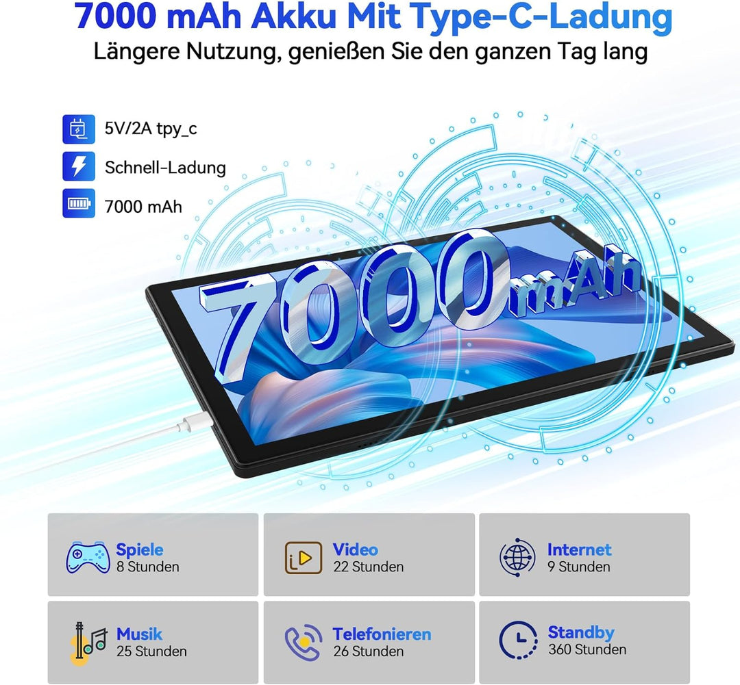 - 🔋GROSSER 7000mAH-AKKU: Das Android 12-Tablet verfügt über einen grossen 7000-mAh-Akku, der bis zu 360 Stunden Standby-Zeit, 8 Stunden Spielzeit, 9 Stunden Web-Browsing, 20+ Stunden Musik- und Videowiedergabe sowie Anrufe ermöglicht. Das Aufladen